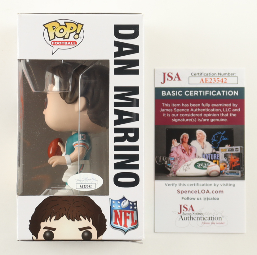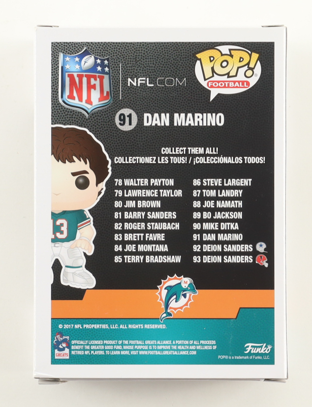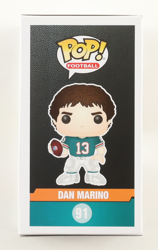 Funko Pop! vinyl figure measures approximately 4" in height and has been hand-signed on the packaging by Dan Marino (Miami Dolphins, HOF).