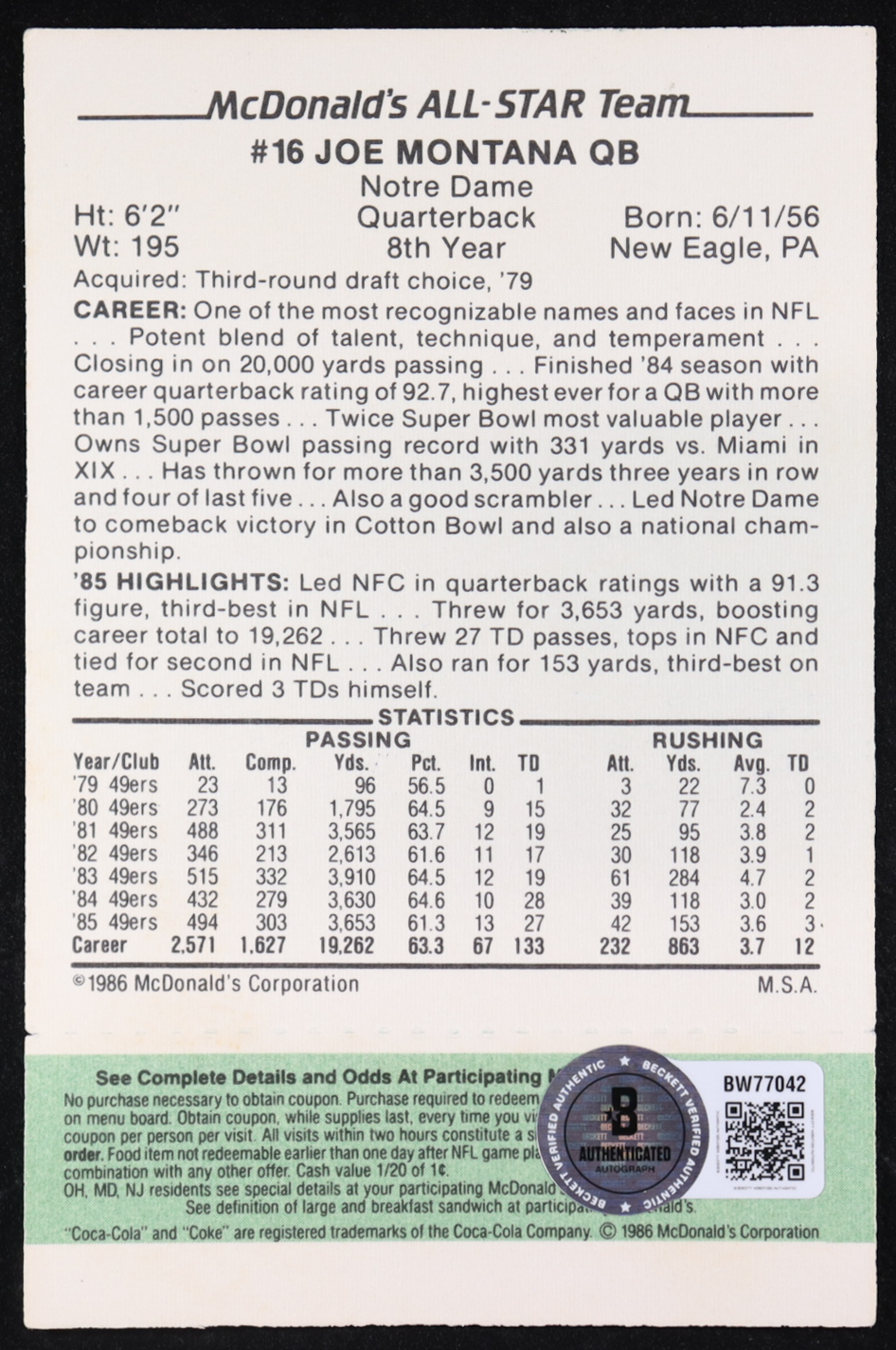 Joe Montana Signed 1986 McDonald's All-Stars Green Tab #16 (Beckett)