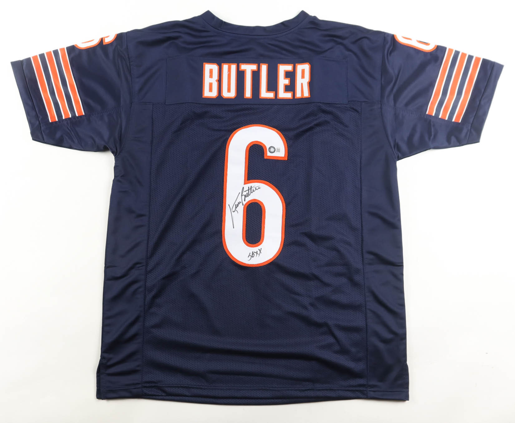 Custom jersey with everything sewn on, size XL. Hand-signed and inscribed by Kevin Butler.