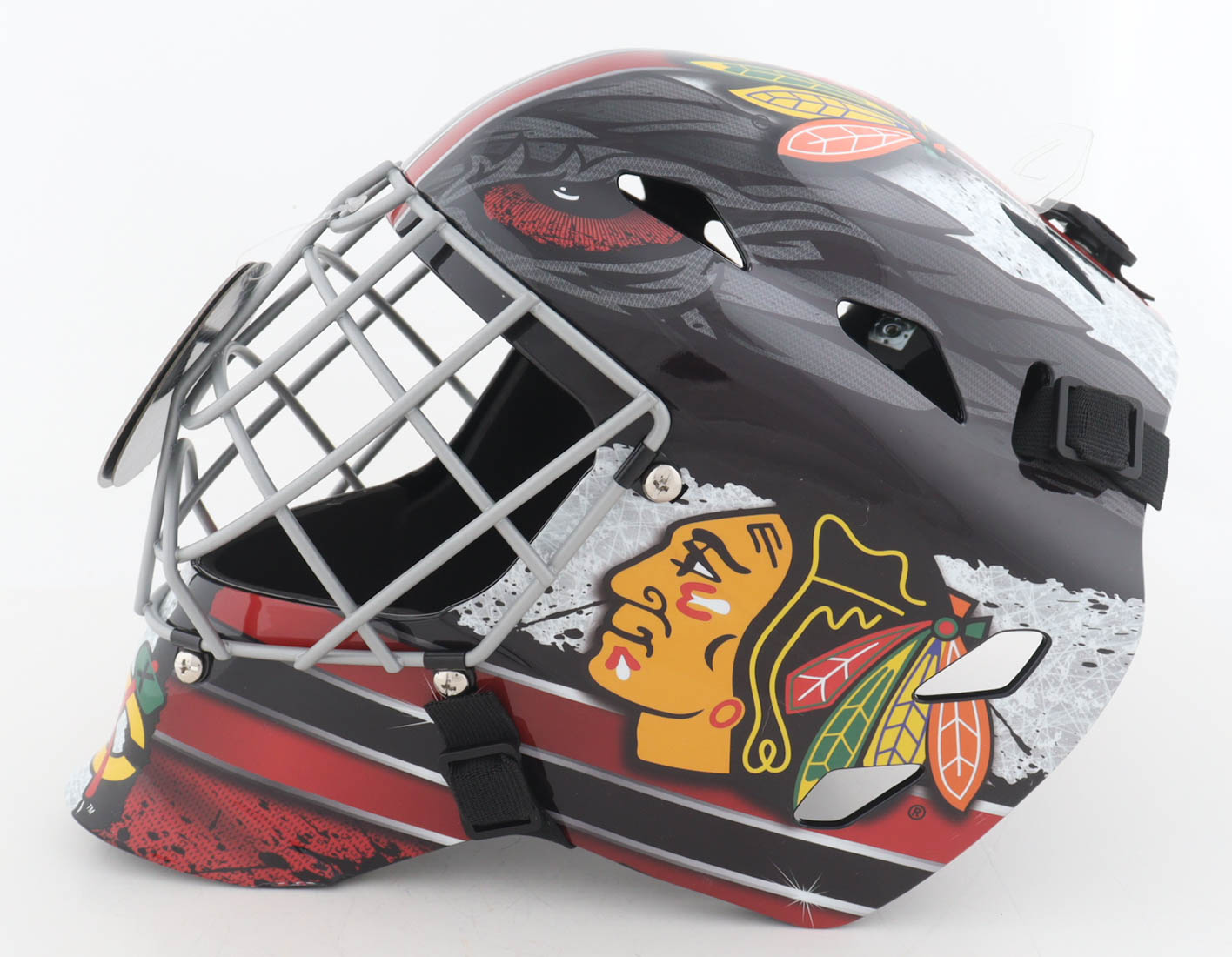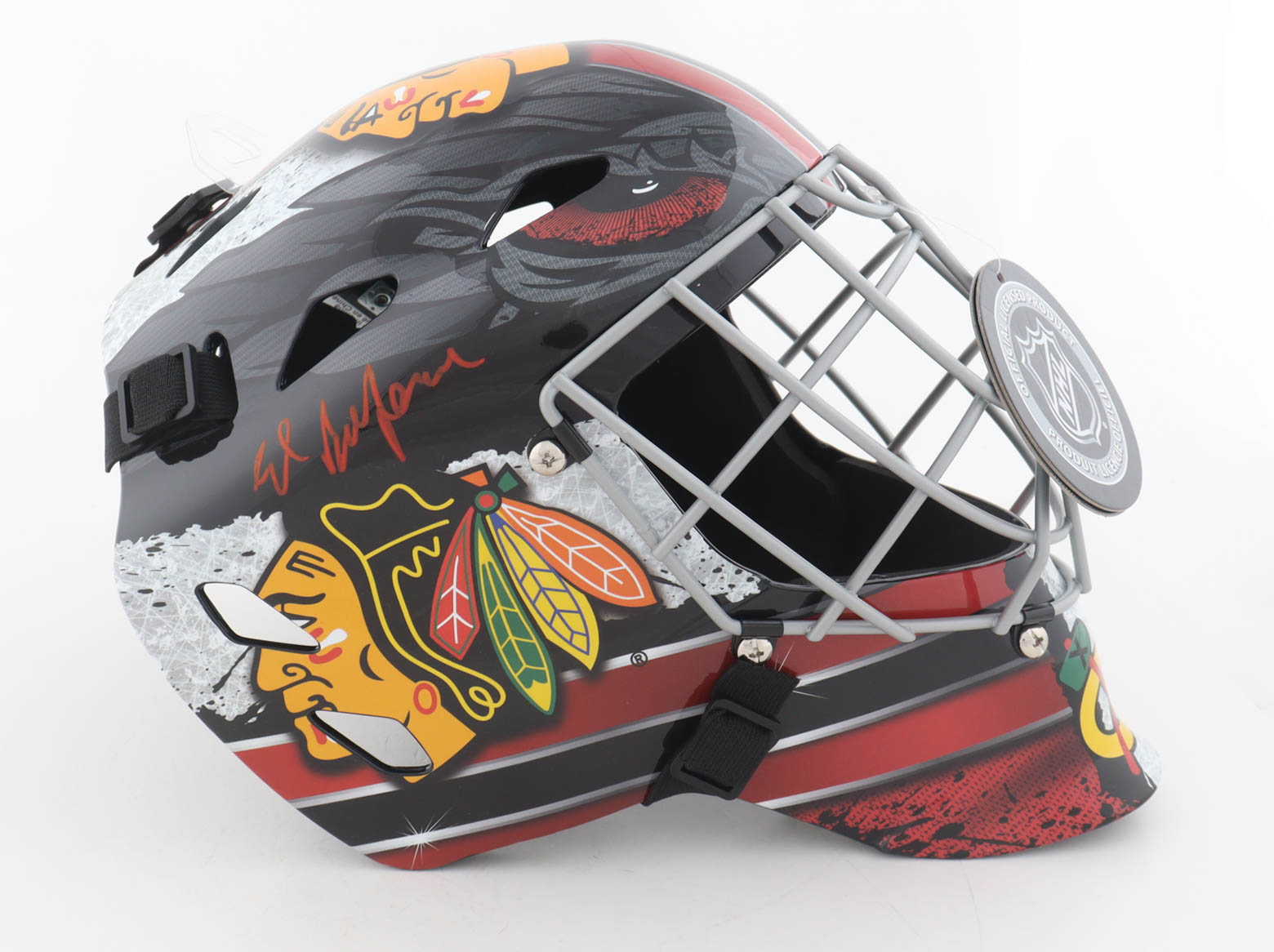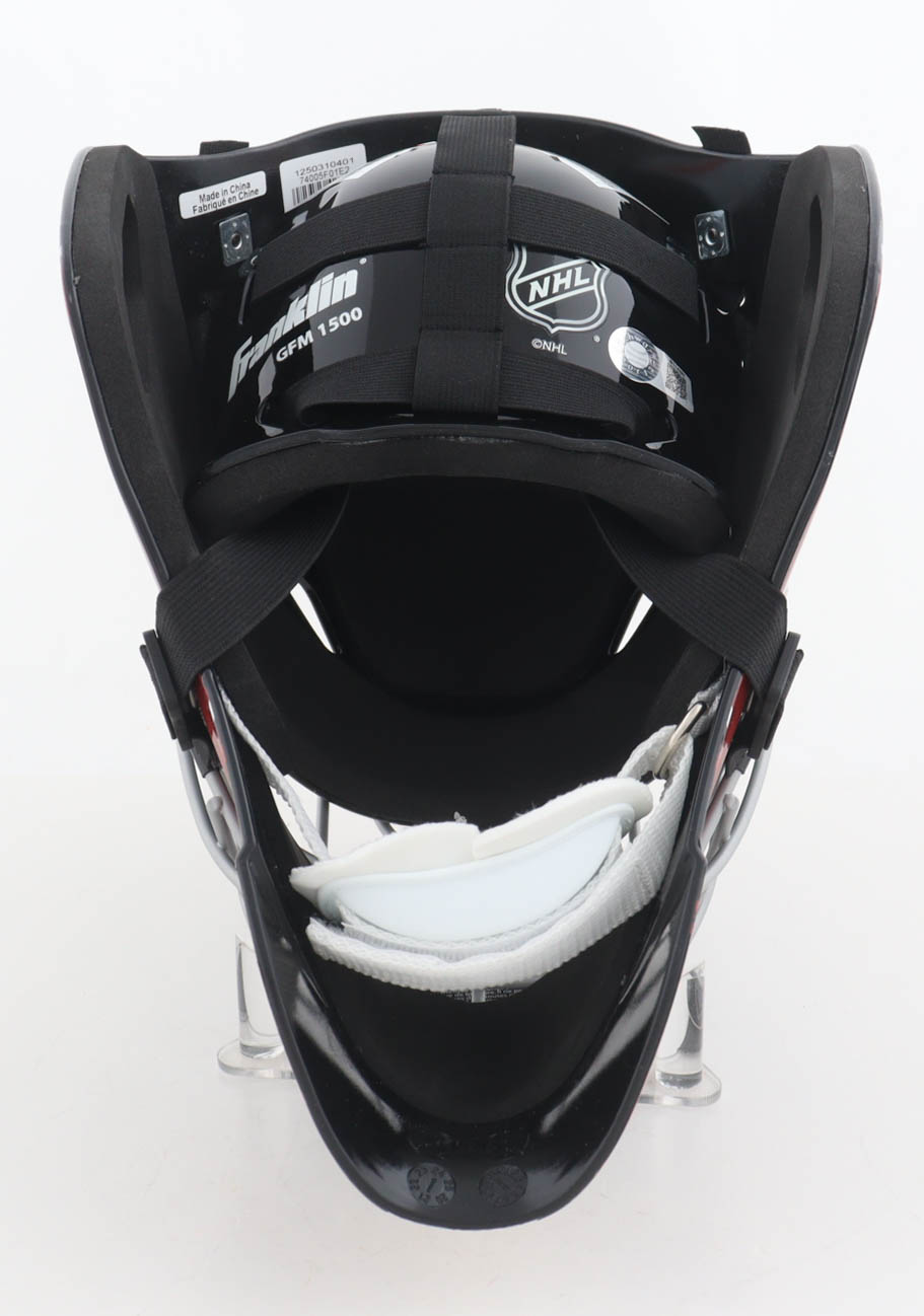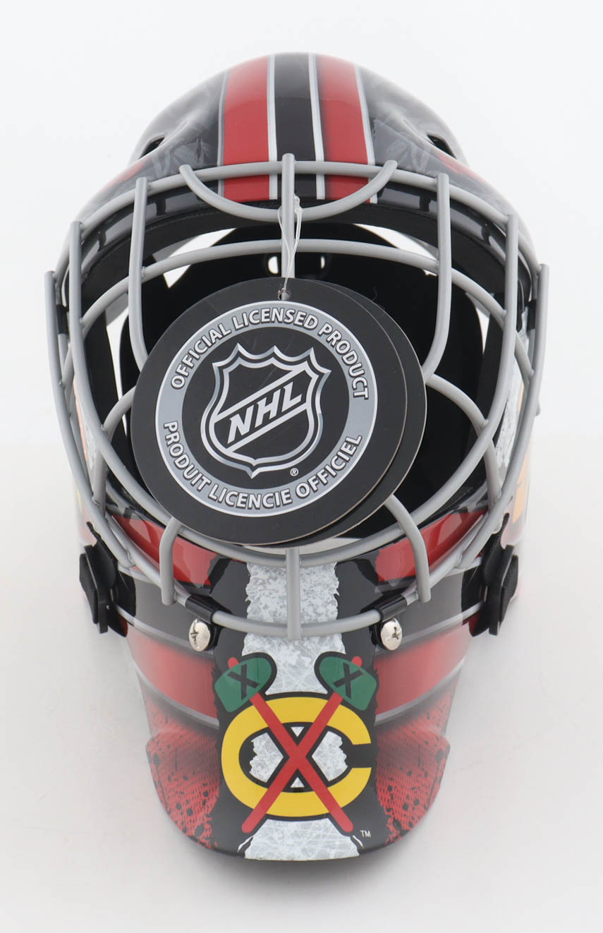 Franklin Chicago Blackhawks full-size replica goalie mask has been hand-signed and inscribed by Ed Belfour (HOF).