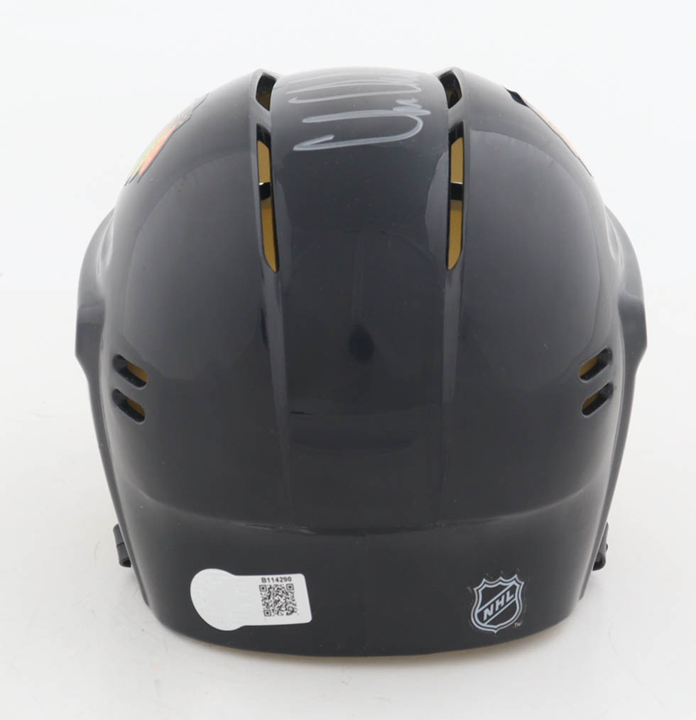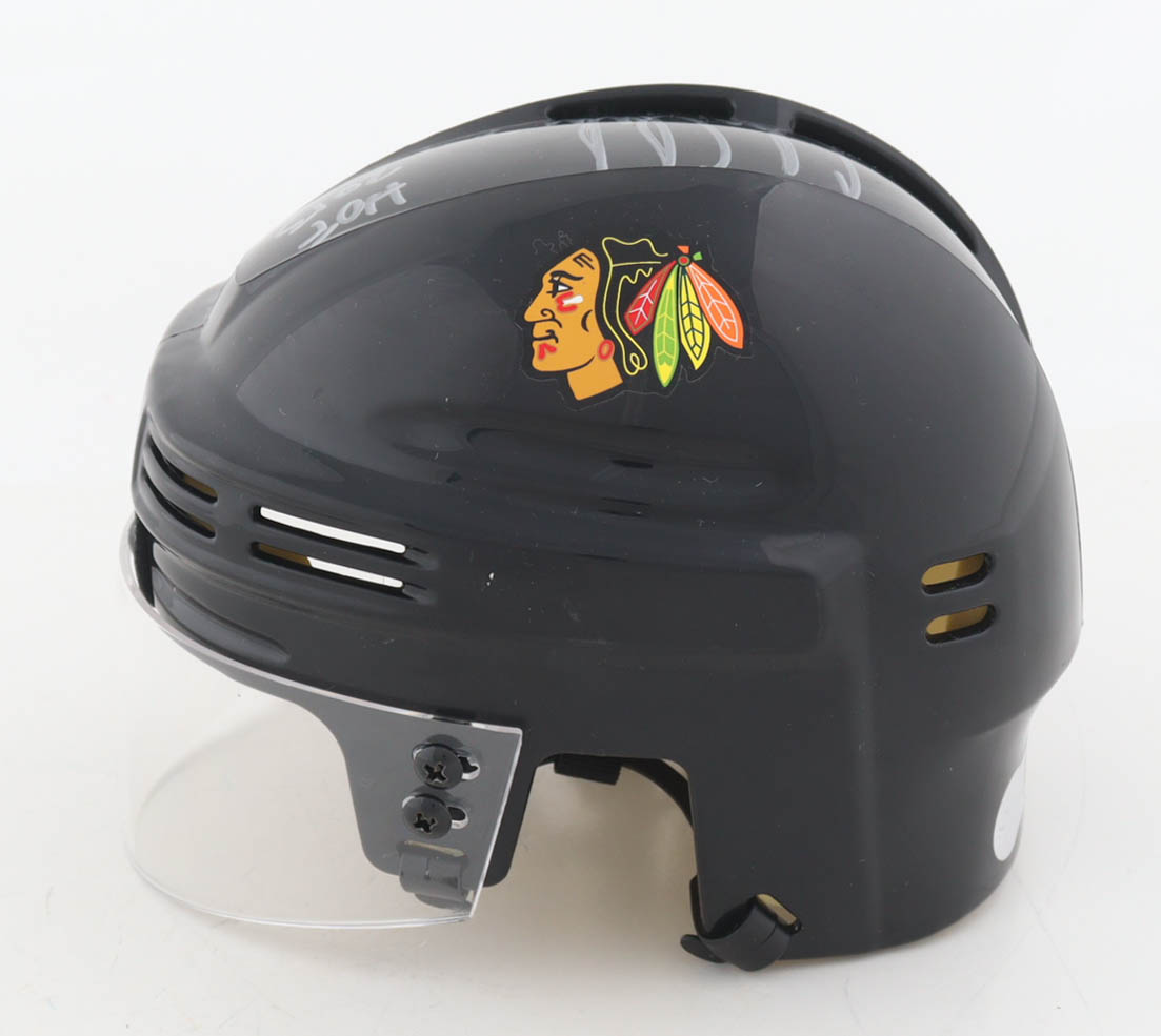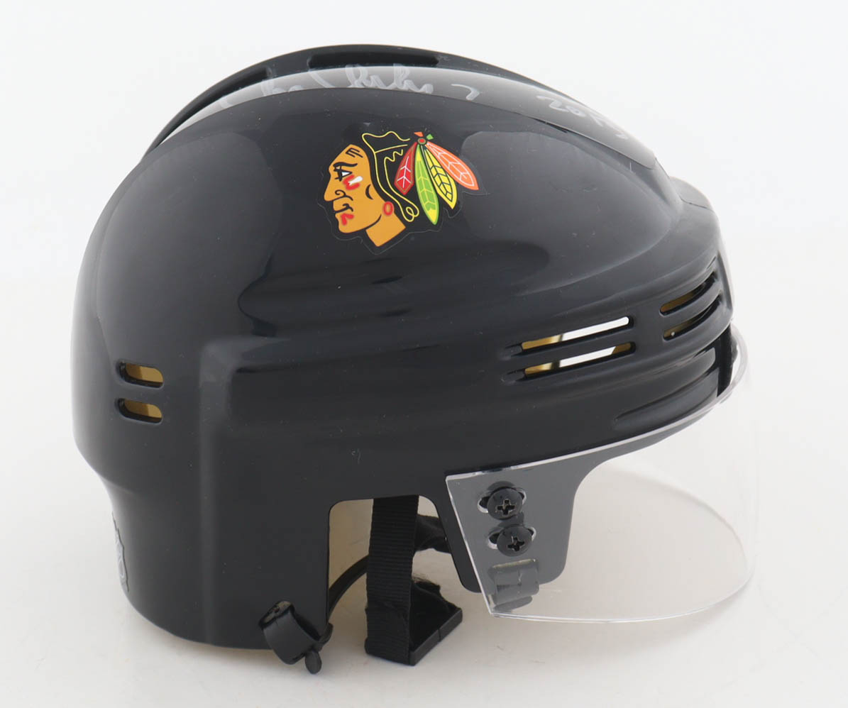 Chicago Blackhawks mini helmet has been hand-signed and inscribed by Chris Chelios (HOF).