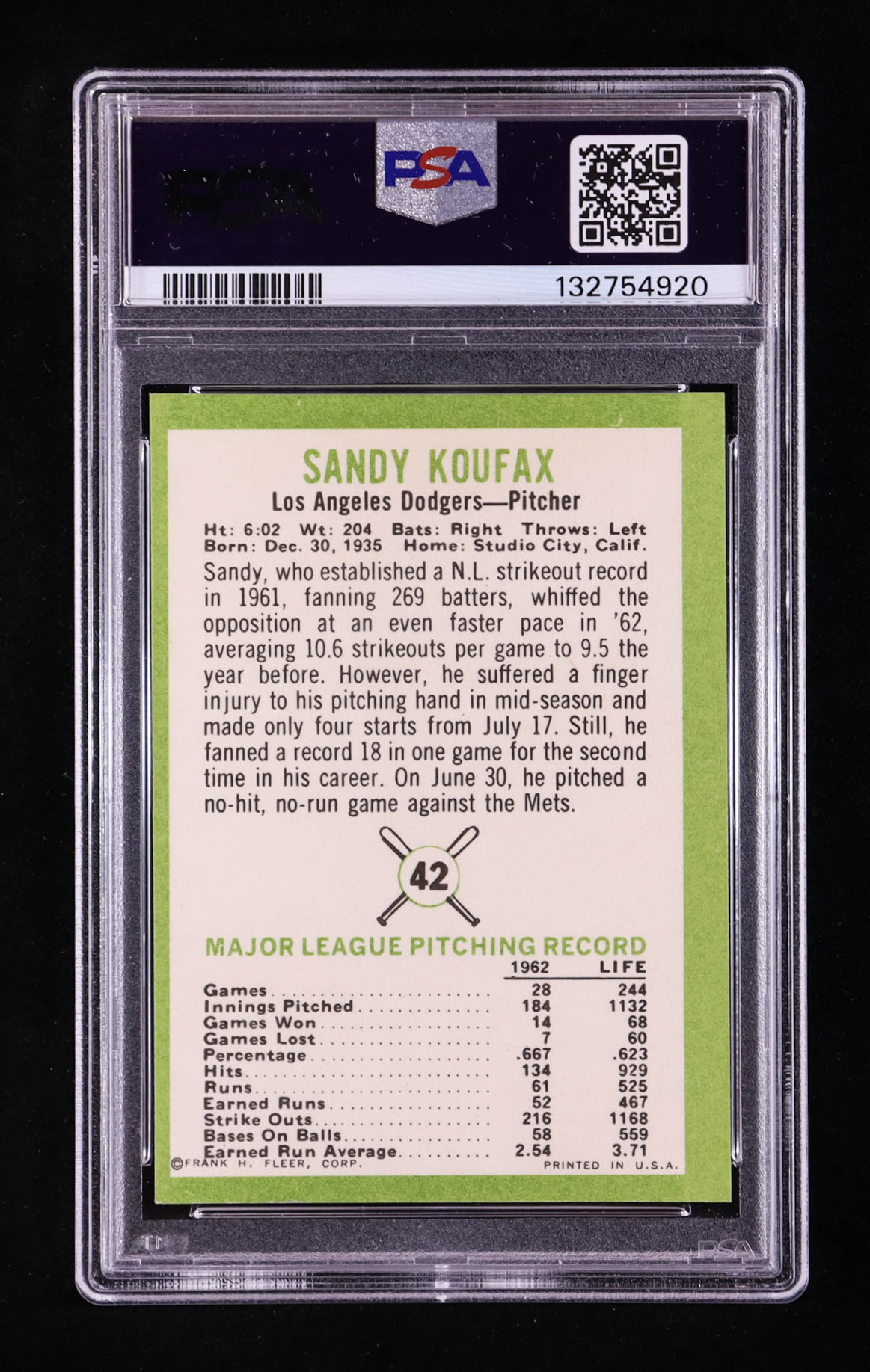Sandy Koufax 1963 Fleer #42 (PSA 8)