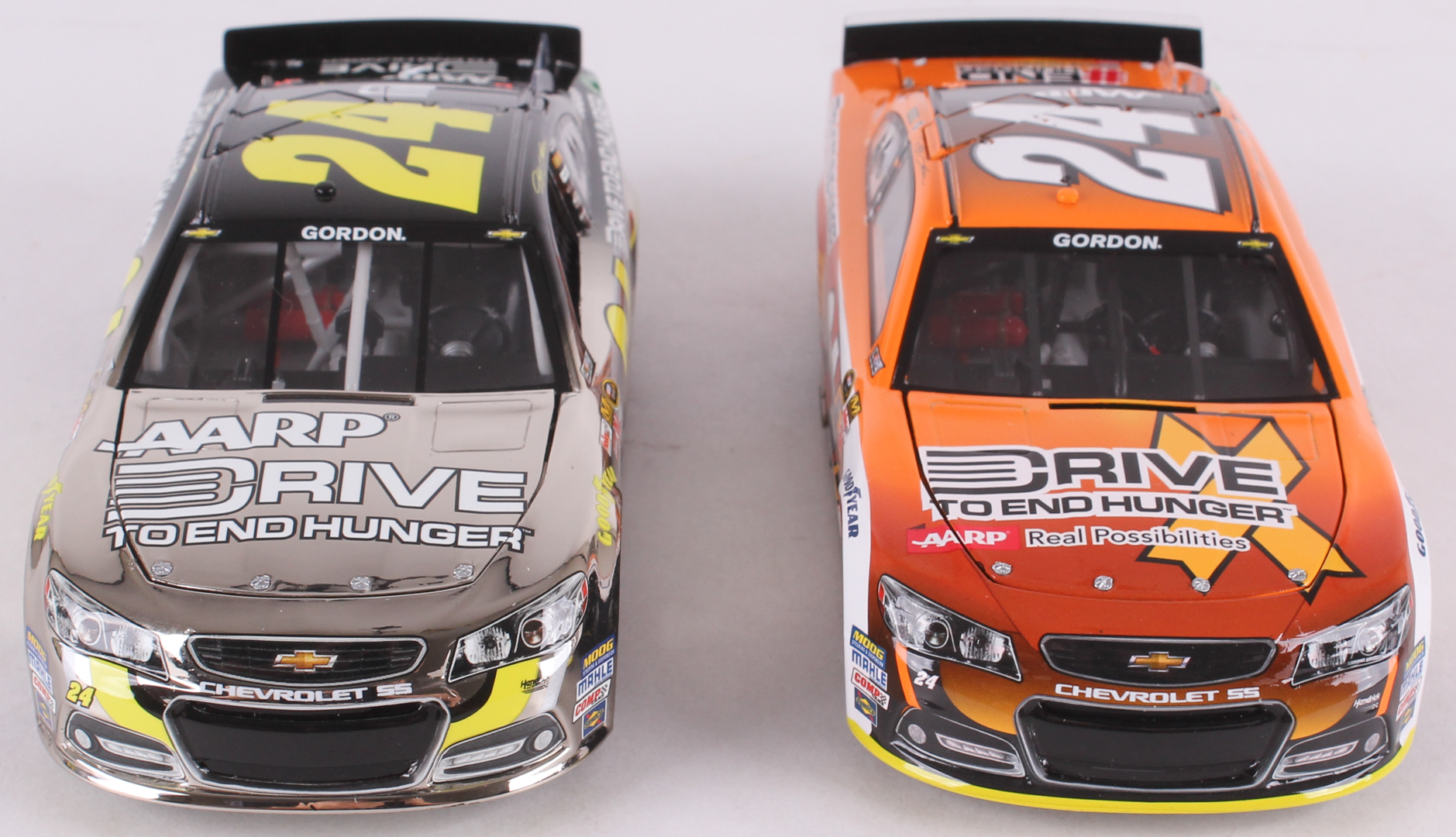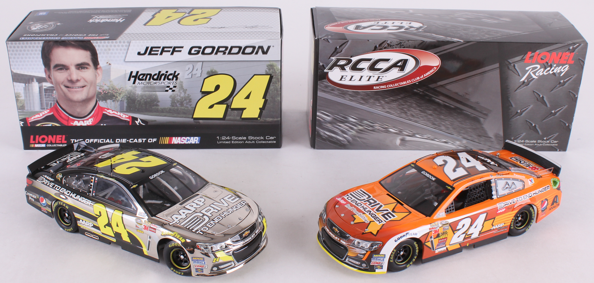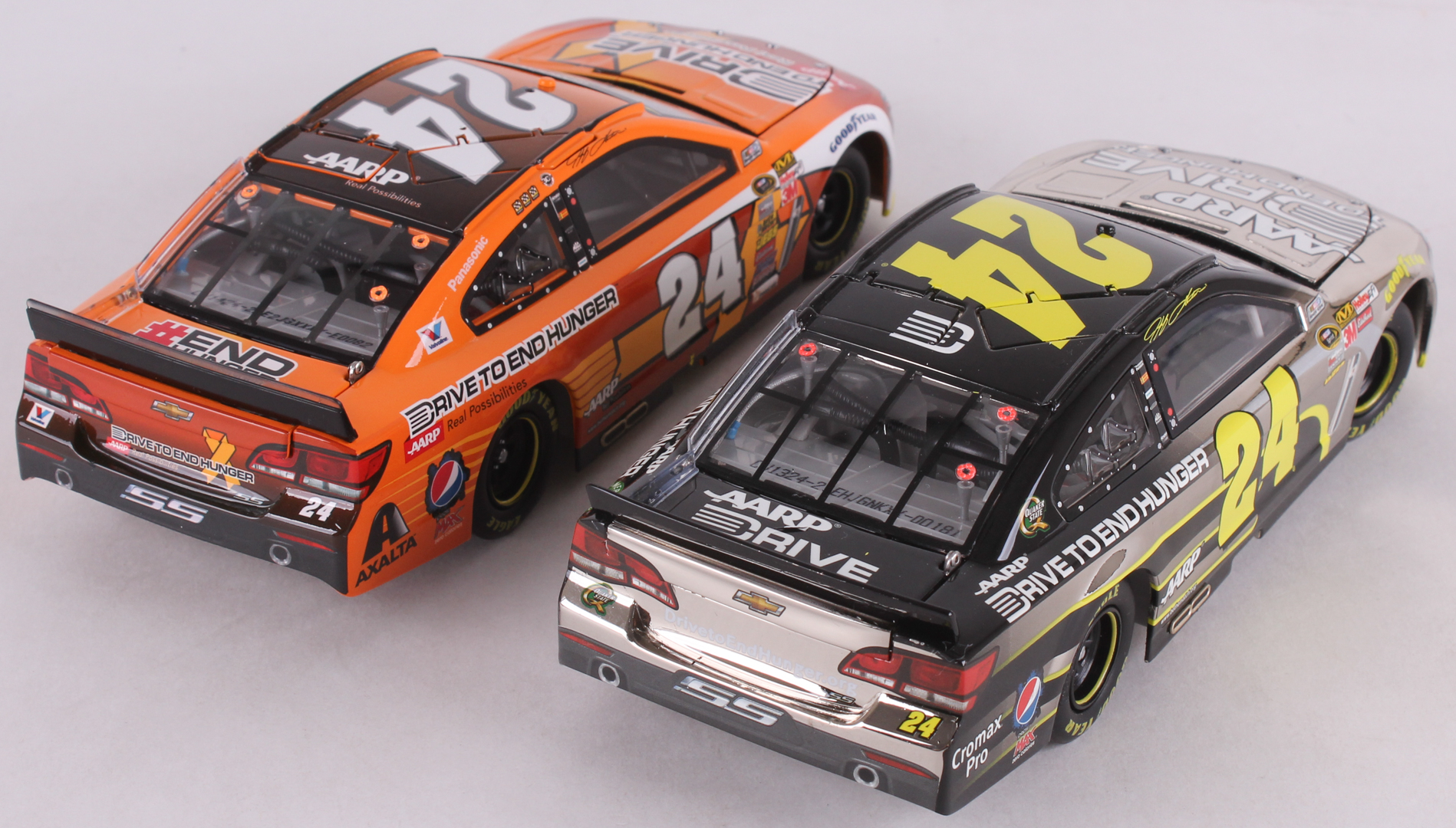 Lot of (2) #24 Jeff Gordon AARP Chevy SS 1:24 Diecast Cars with (1) 2013 Drive to End Hunger & (1) 2014 Hunger Awareness Month