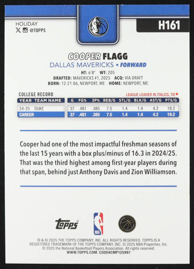 Cooper Flagg 2025-26 Topps #201 RC