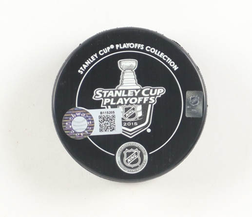 Chicago Blackhawks 2015 Stanley Cup Champions logo hockey puck has been hand-signed by Duncan Keith.