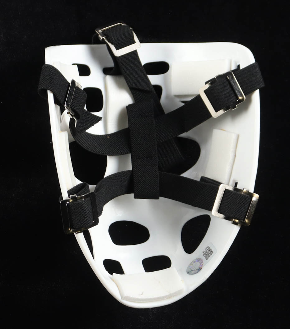 Throwback hockey goalie mask has been hand-signed and inscribed by Gerry Cheevers (Boston Bruins, HOF).