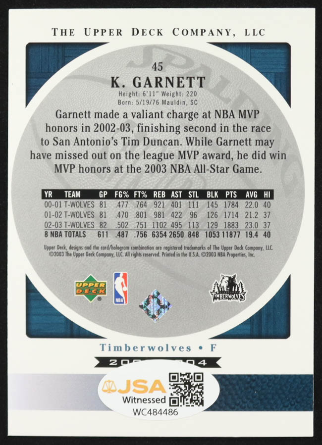 Kevin Garnett Signed 2003-04 Upper Deck Standing O #45 (JSA)