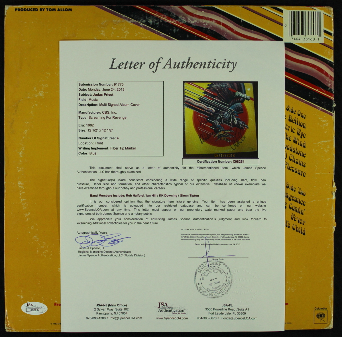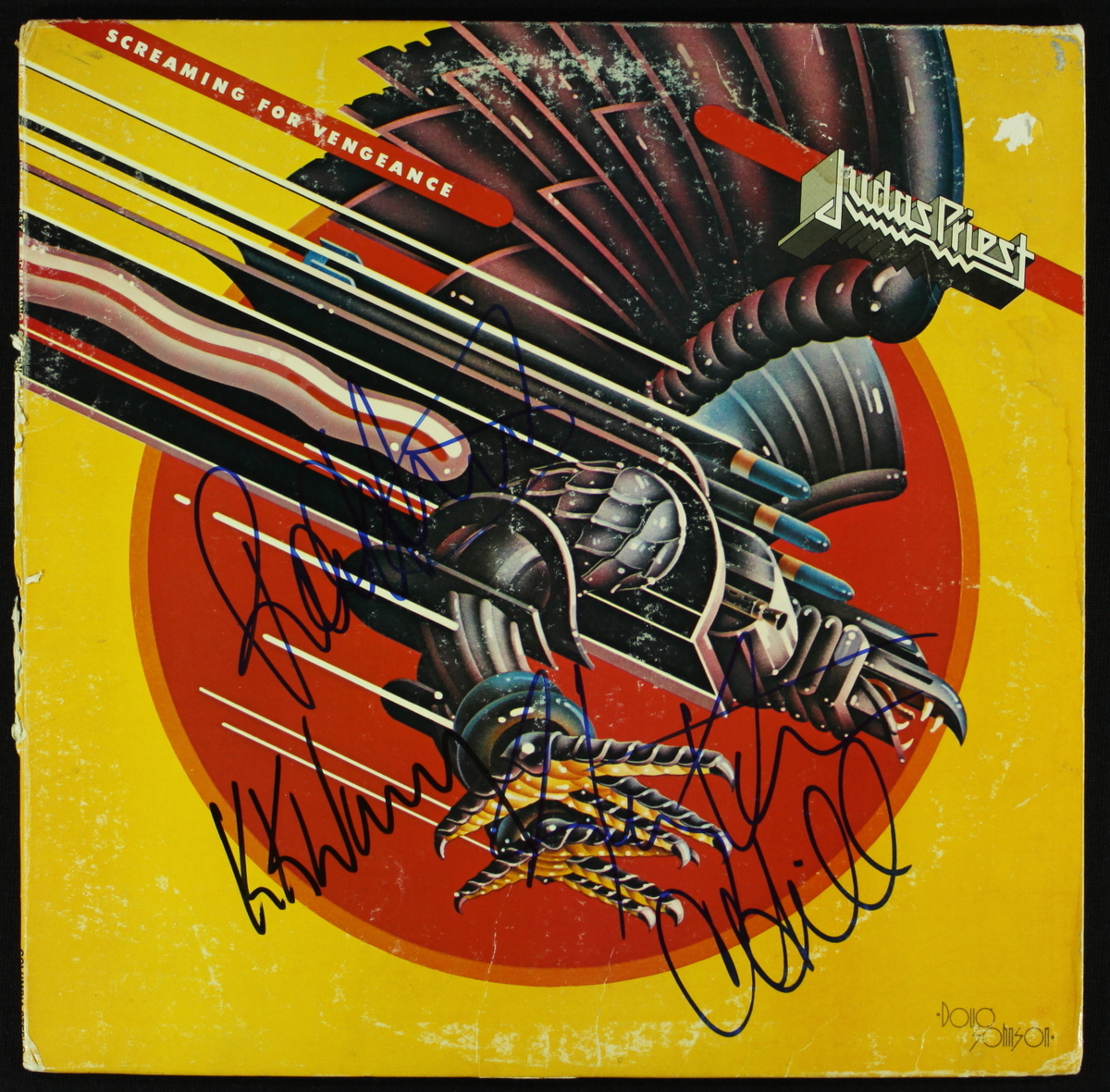 Album cover has been hand-signed in blue felt-tip pen by Ian Hill, Rob Halford, KK Downing and Glenn Tipton of Judas Priest. Note, the record itself is not shown but is included. Autographs includes a James Spence Authentication (JSA) hologram and matching LOA for authenticity purposes.