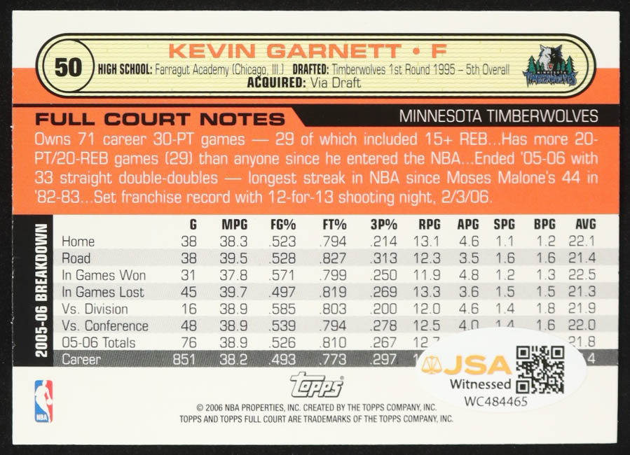 Kevin Garnett Signed 2006-07 Topps Full Court #50 (JSA)