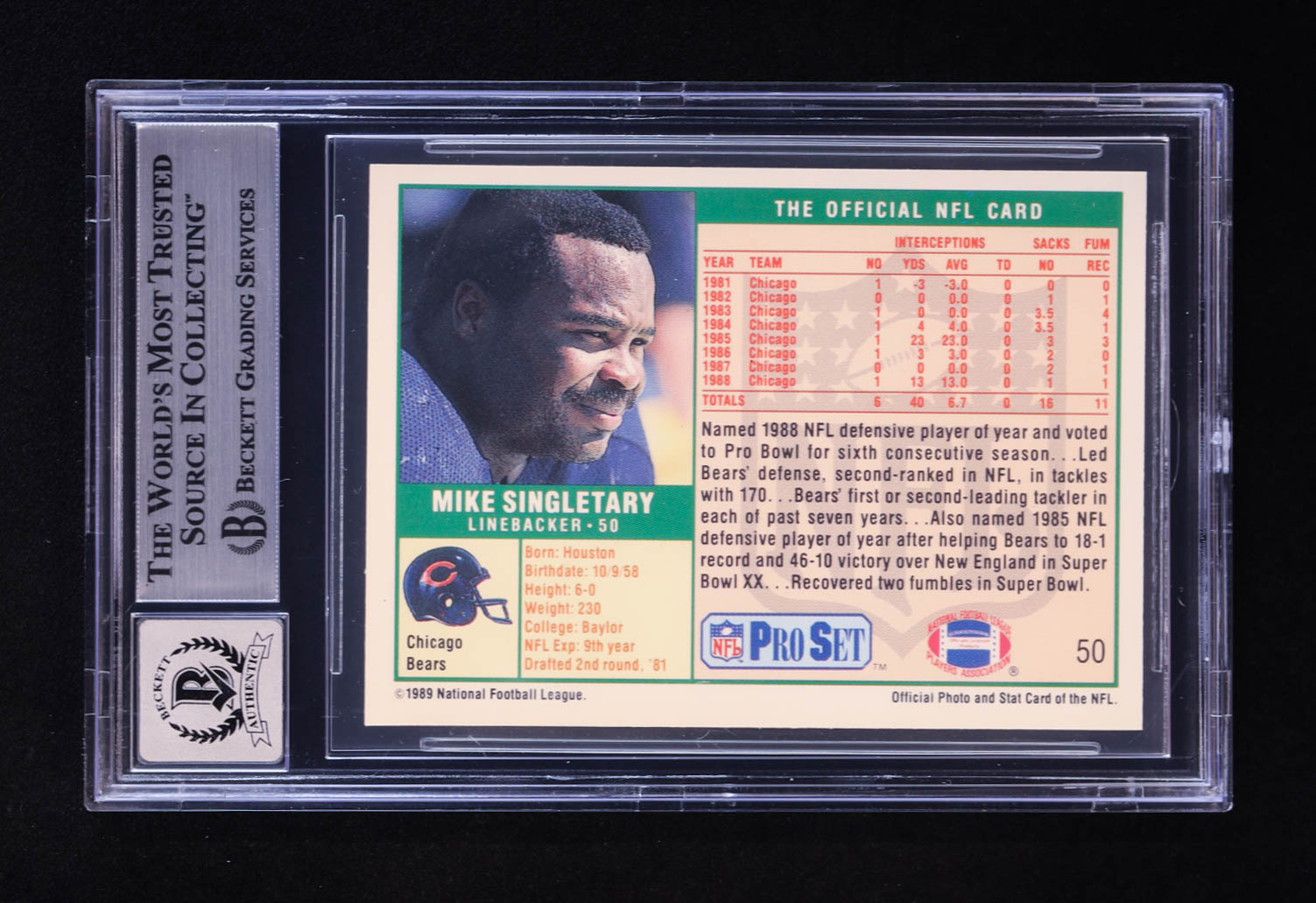 Mike Singletary Signed 1989 Pro Set #50 (BGS | Auto 10)