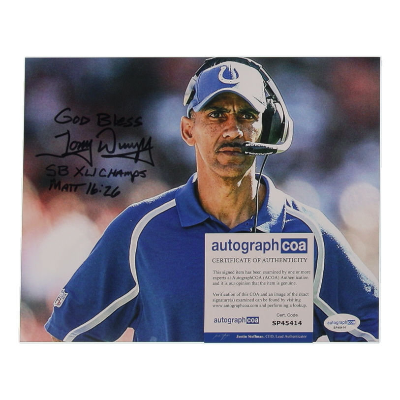 Photo measures 8" x 10" in size and is hand-signed and inscribed by Tony Dungy (Indianapolis Colts, HOF).