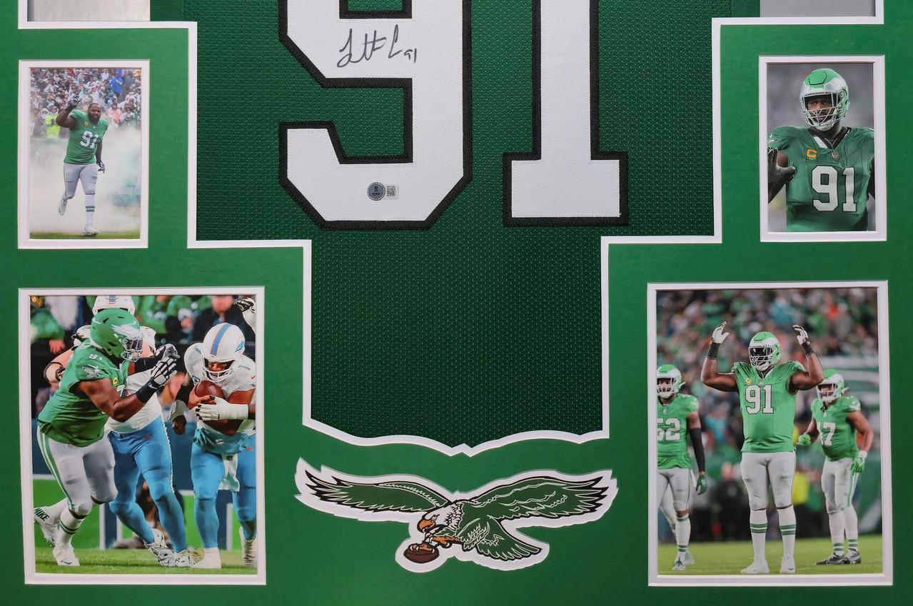 Custom frame measures 34" x 42" in size and features a jersey that has been hand-signed by Fletcher Cox.