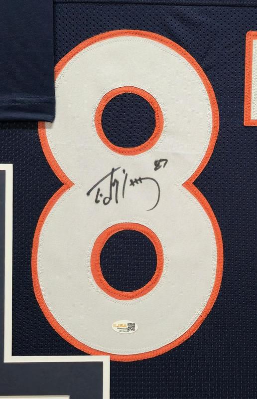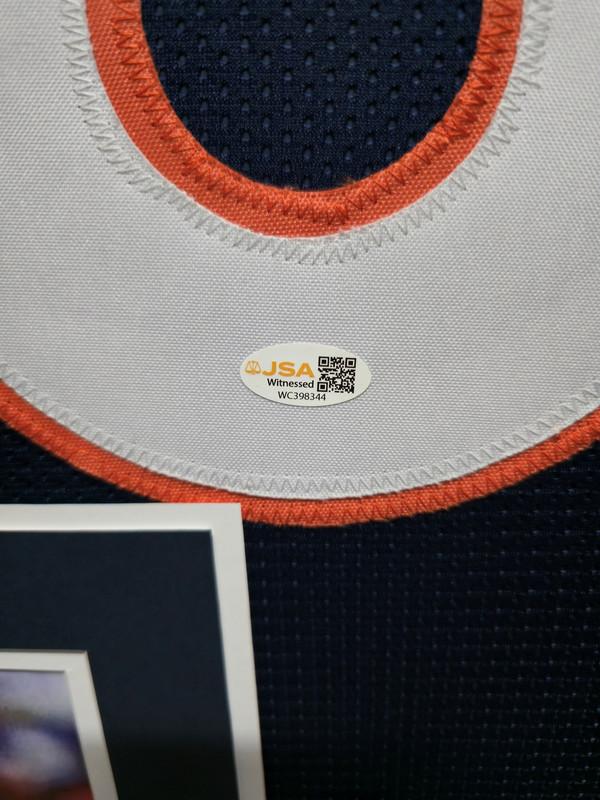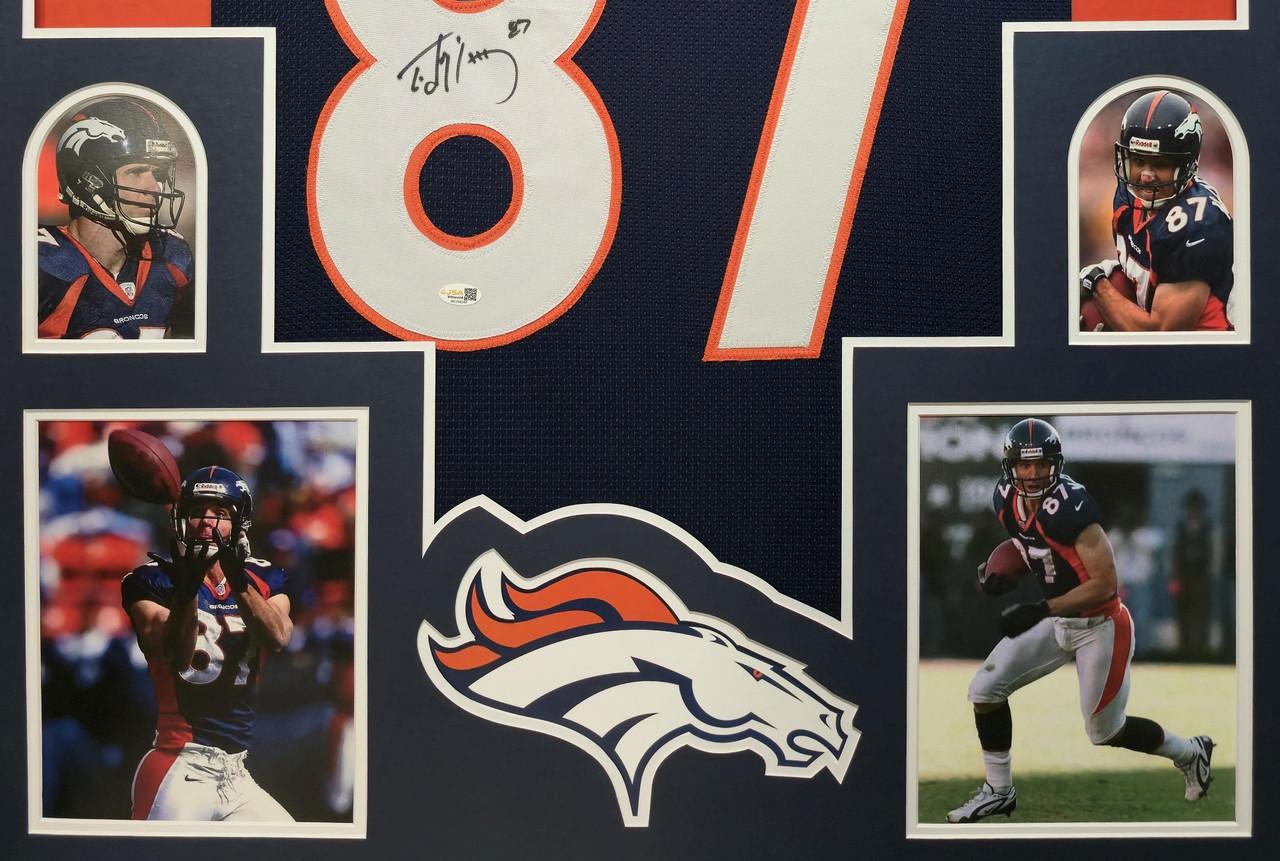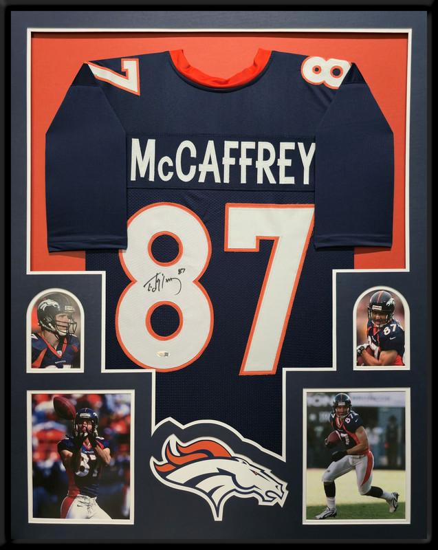 Custom frame measures 34" x 42" in size and features a jersey that has been hand-signed by Ed McCaffrey.