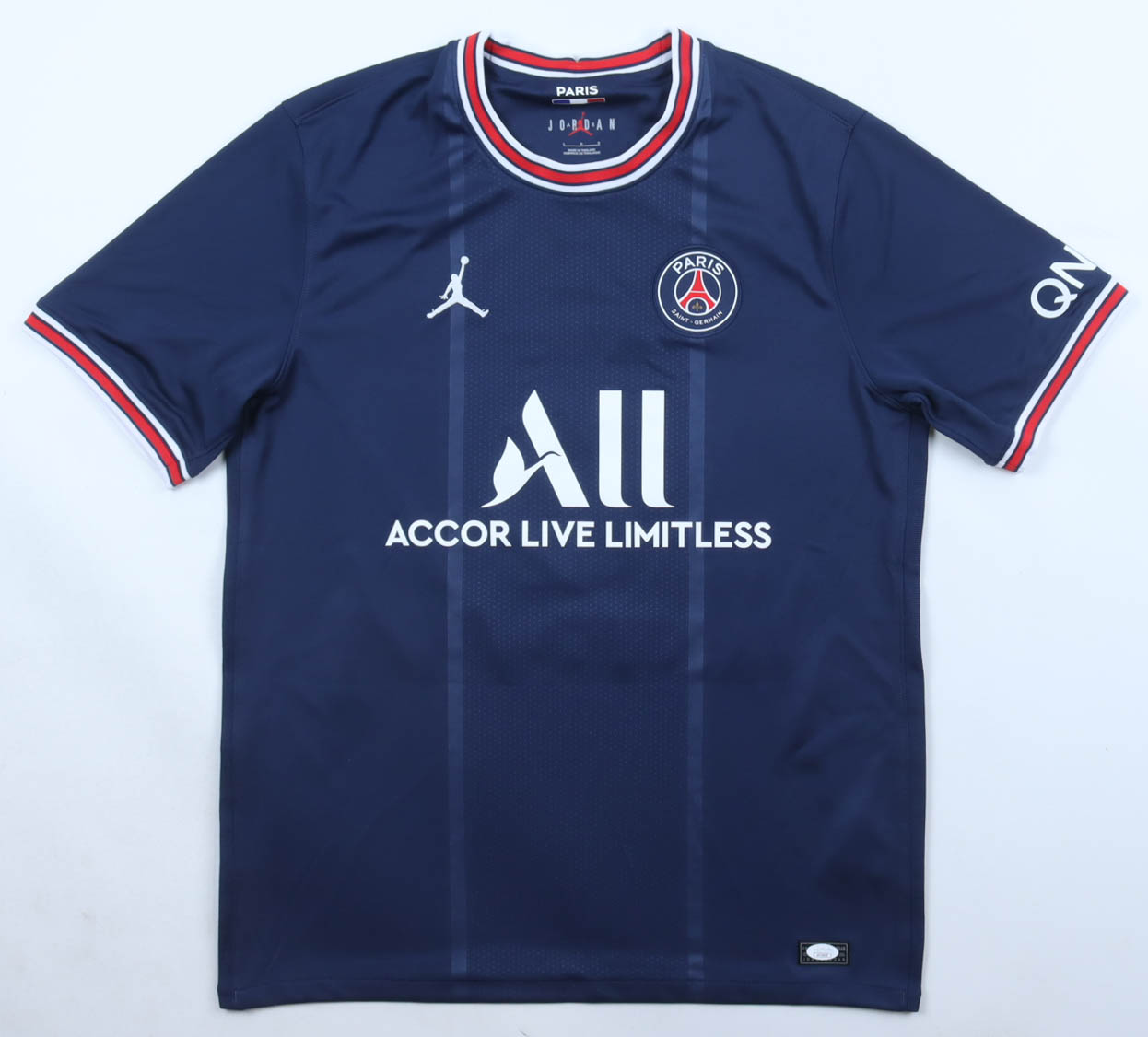 Jordan authentic jersey with everything pressed on, size L. Hand-signed by Marquinhos (Paris Saint-Germain FC).