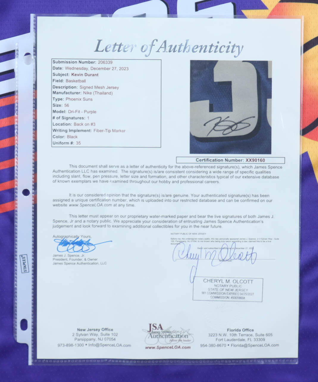 Nike authentic jersey with everything pressed on, size 56. Hand-signed by Kevin Durant (Phoenix Suns).
