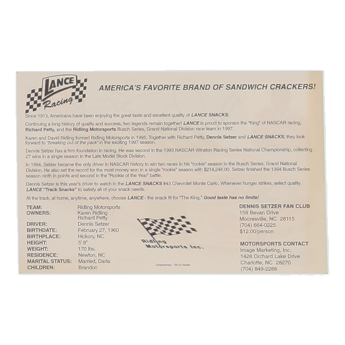 Dennis Setzer Signed NASCAR 6x9 Hero Card (Beckett)