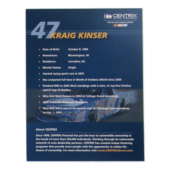 Kraig Kinser Signed NASCAR 6x8 Hero Card (Beckett)