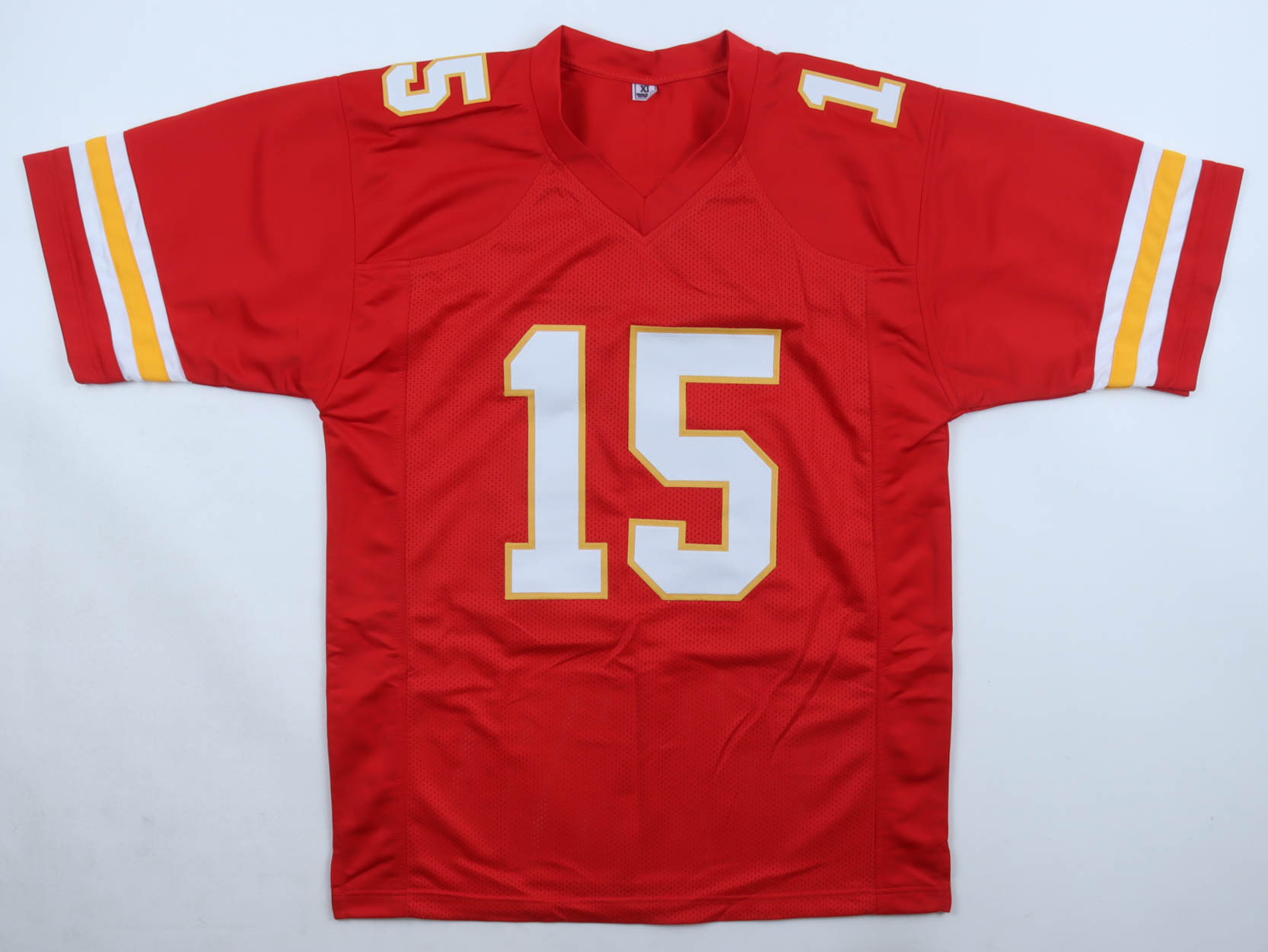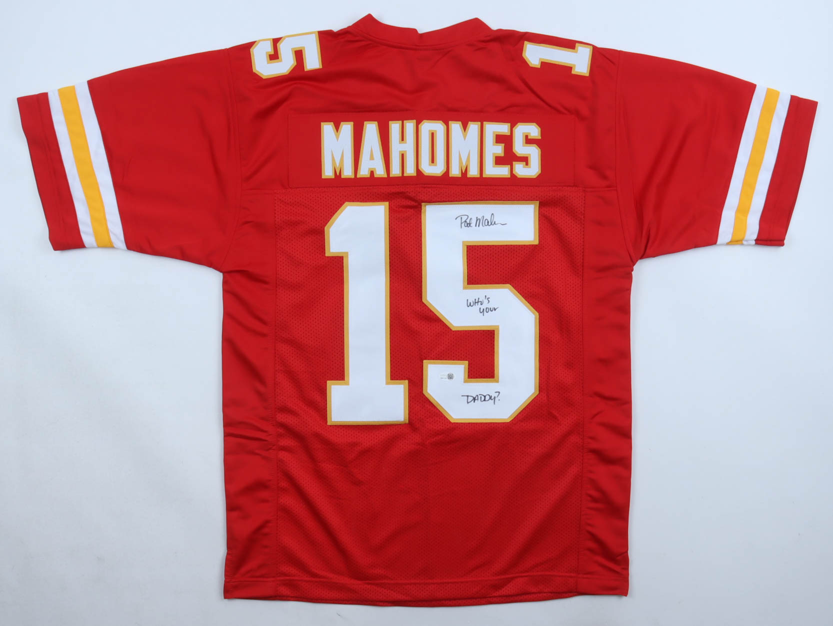 Custom jersey with everything sewn on, size XL. Hand-signed and inscribed by Patrick Mahomes Sr.