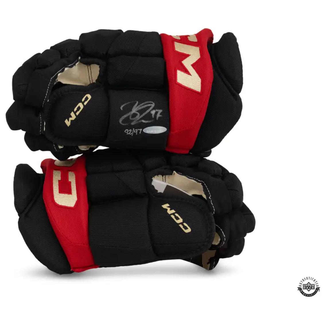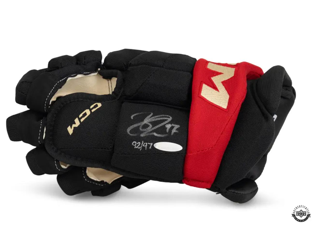 Pair of CCM Black Tacks X hockey gloves have been hand-signed by Connor McDavid (Edmonton Oilers). This item is limited edition and numbered #/97.