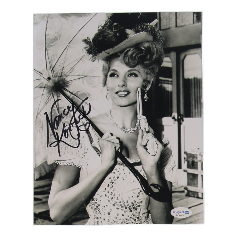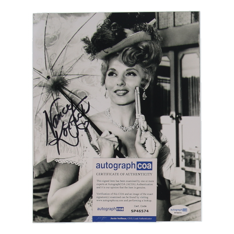Photo measures 8" x 10" in size and has been hand-signed by Nancy Kovack.