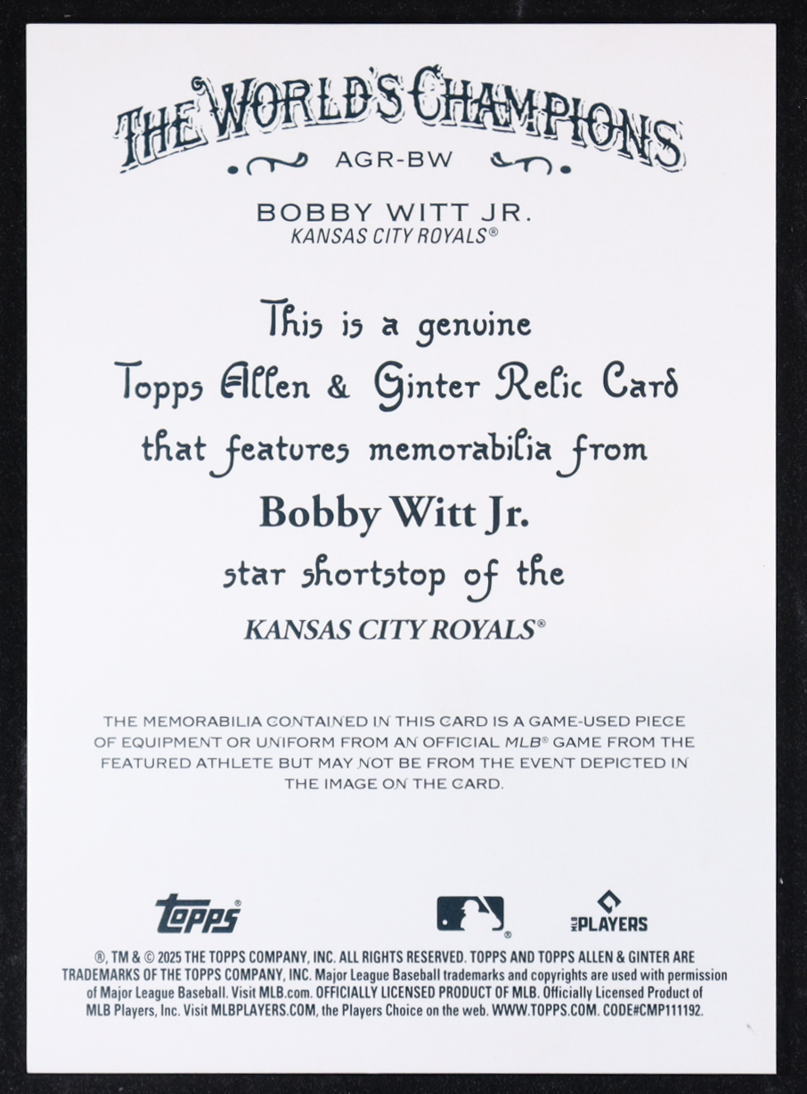 Bobby Witt Jr. 2025 Topps Allen and Ginter Relics #AGRBW