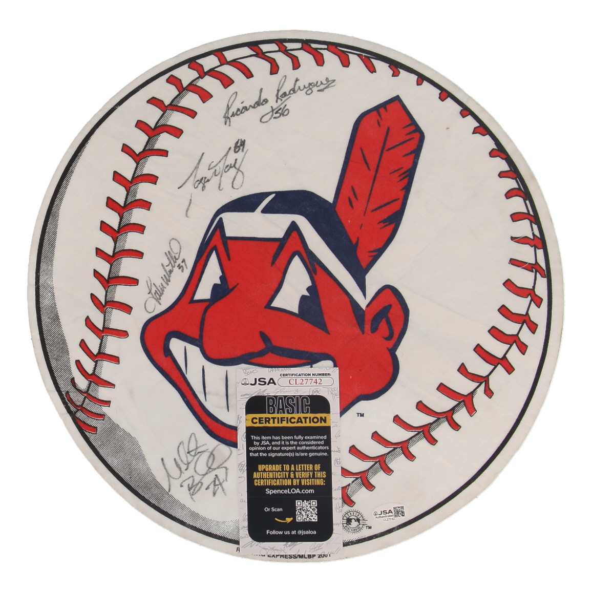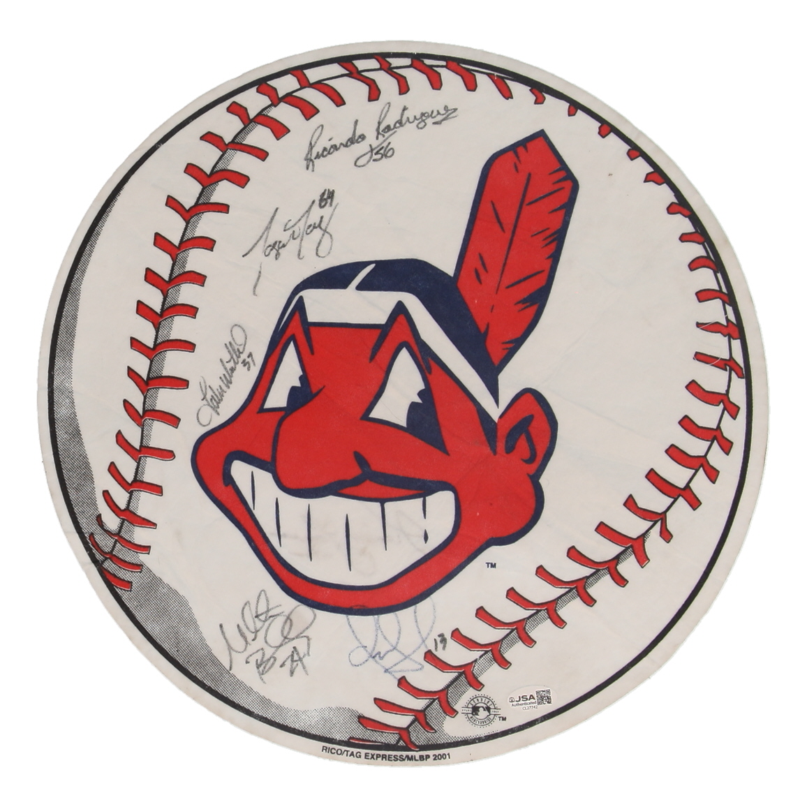 Cleveland Indians circular pennant measures 14" x 14" in size. Hand-signed by Omar Vizquel, Milton Bradley, Jason Davis, Karim Garcia, Ricardo Rodriguez, and Jake Westbrook.