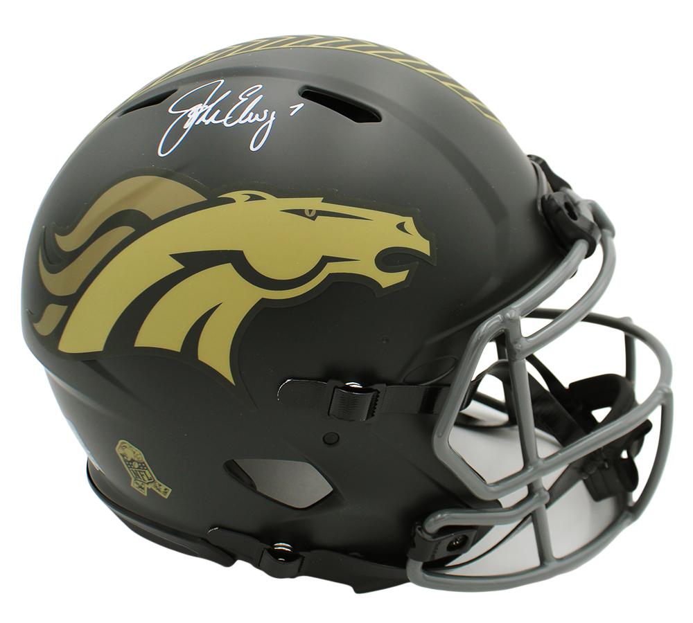 Riddell Denver Broncos full-size authentic on-field salute to service alternate speed helmet. Hand-signed by John Elway (HOF).