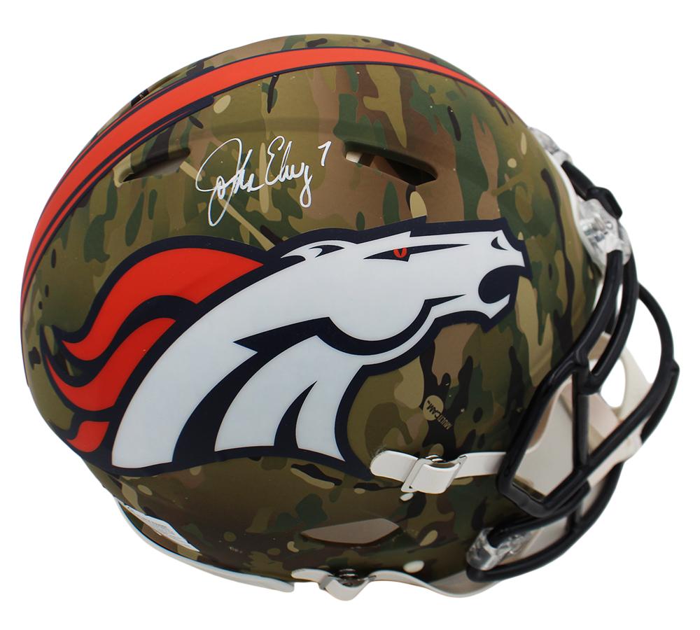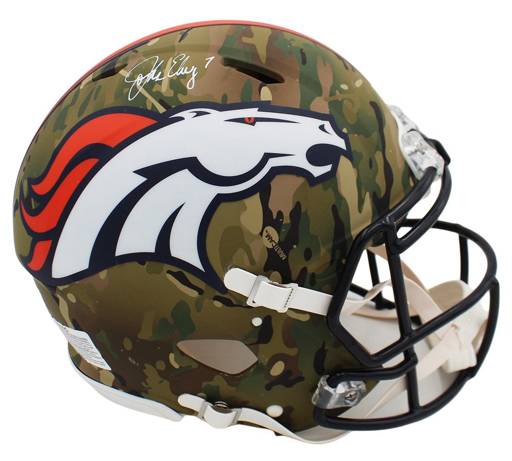 Riddell Denver Broncos full-size authentic on-field camo alternate speed helmet. Hand-signed by John Elway (HOF).