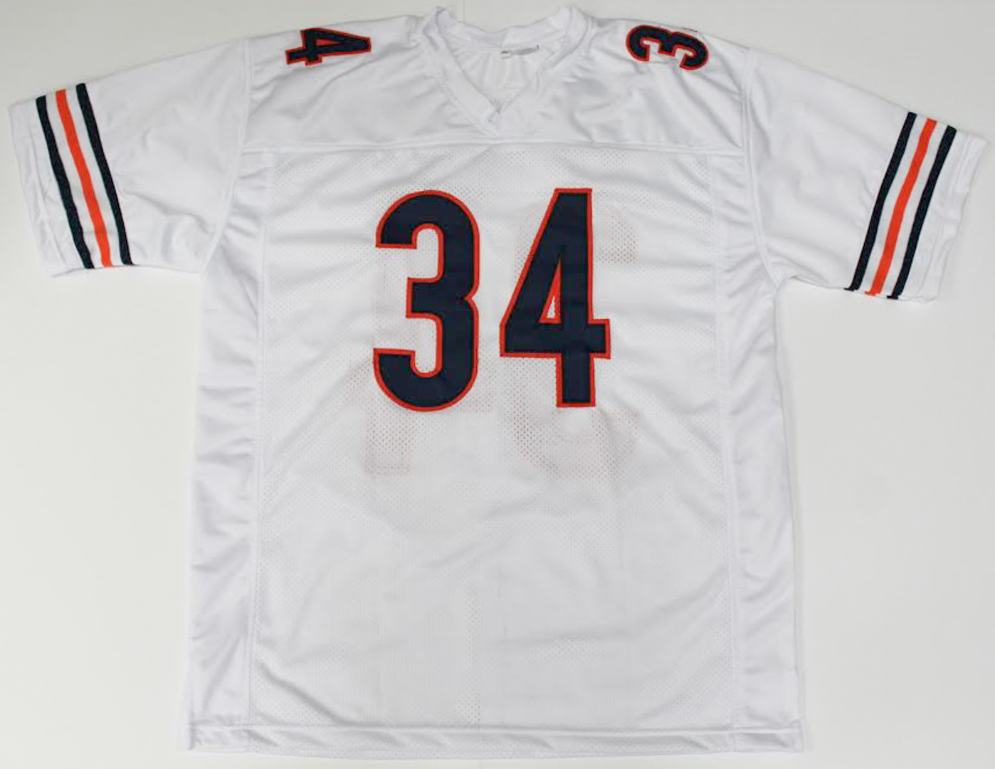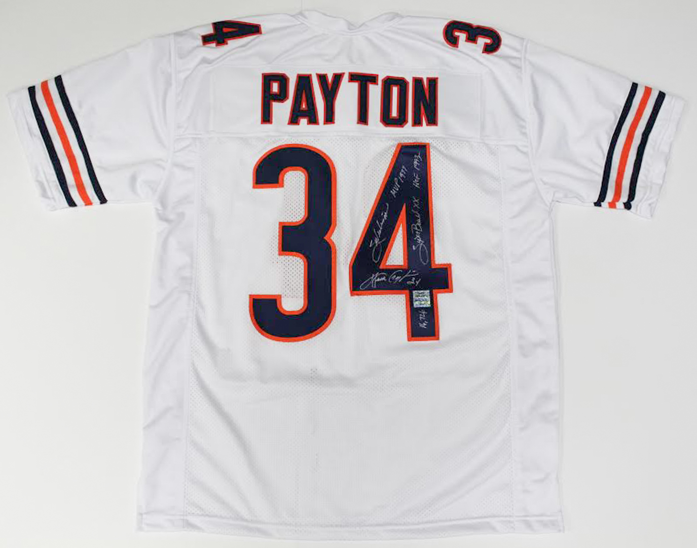 Custom on-field style jersey. Everything sewn on, size XL. Hand-signed and inscribed in silver paint pen by Walter Payton (D. 1999, Bears HOF).