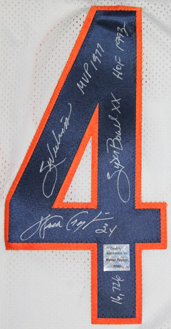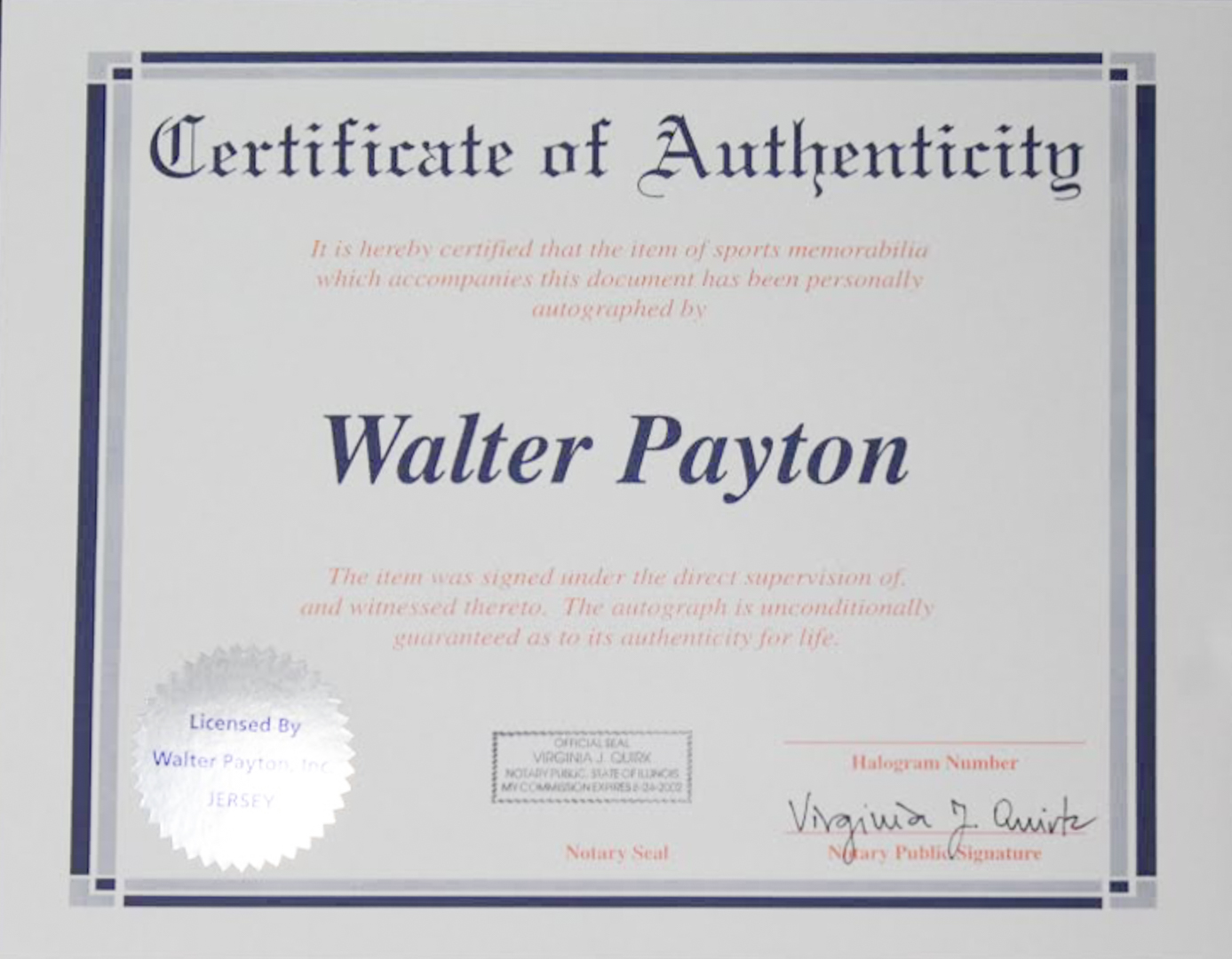 The autograph includes an official Walter Payton hologram and COA from Celebrity Appearances, Inc for authenticity purposes.