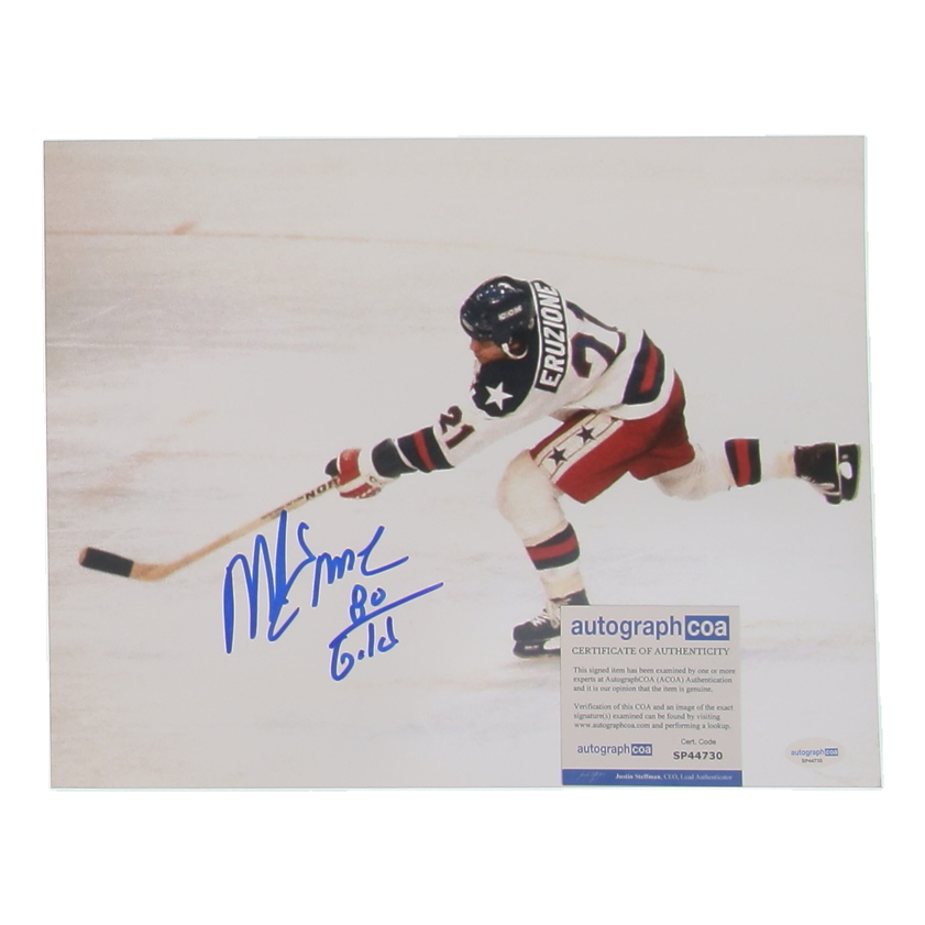 Photo measures 11" x 14" in size and has been hand-signed and inscribed by Mike Eruzione.