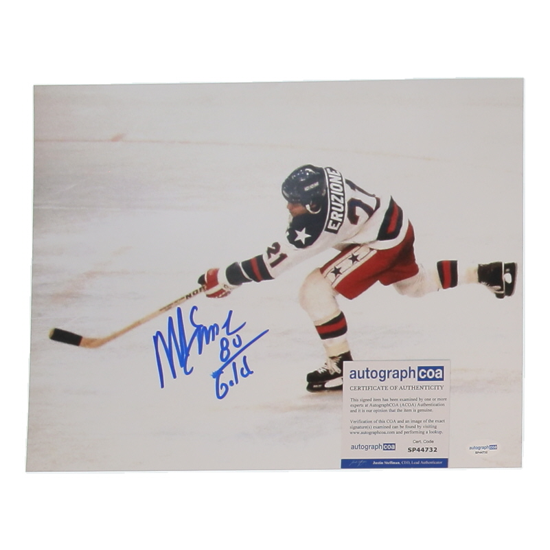 Photo measures 11" x 14" in size and has been hand-signed and inscribed by Mike Eruzione.