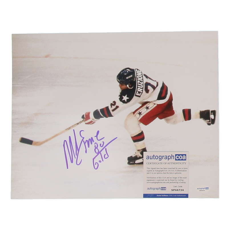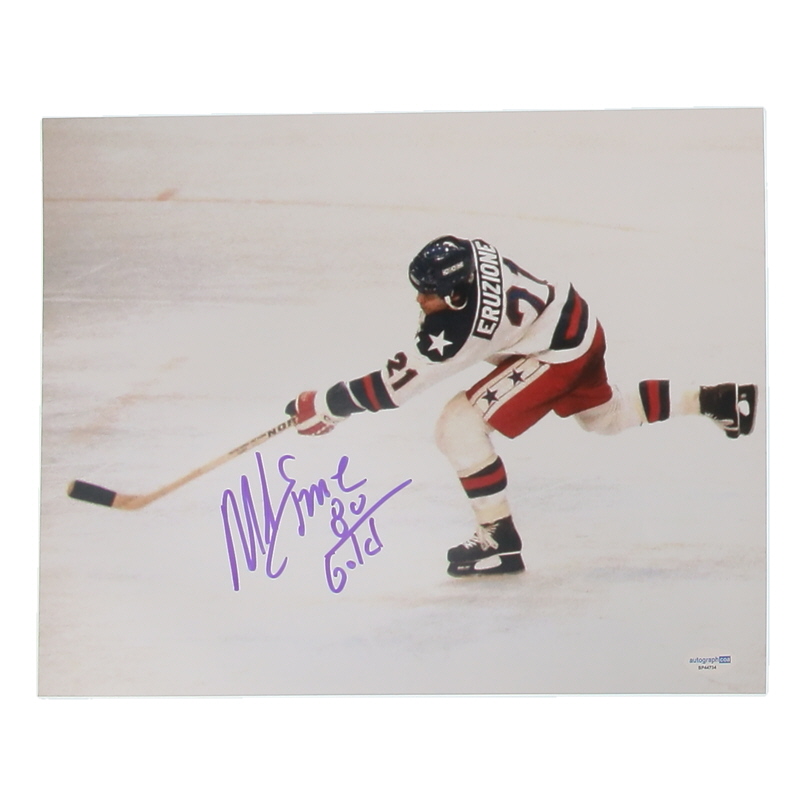 Photo measures 11" x 14" in size and has been hand-signed and inscribed by Mike Eruzione.