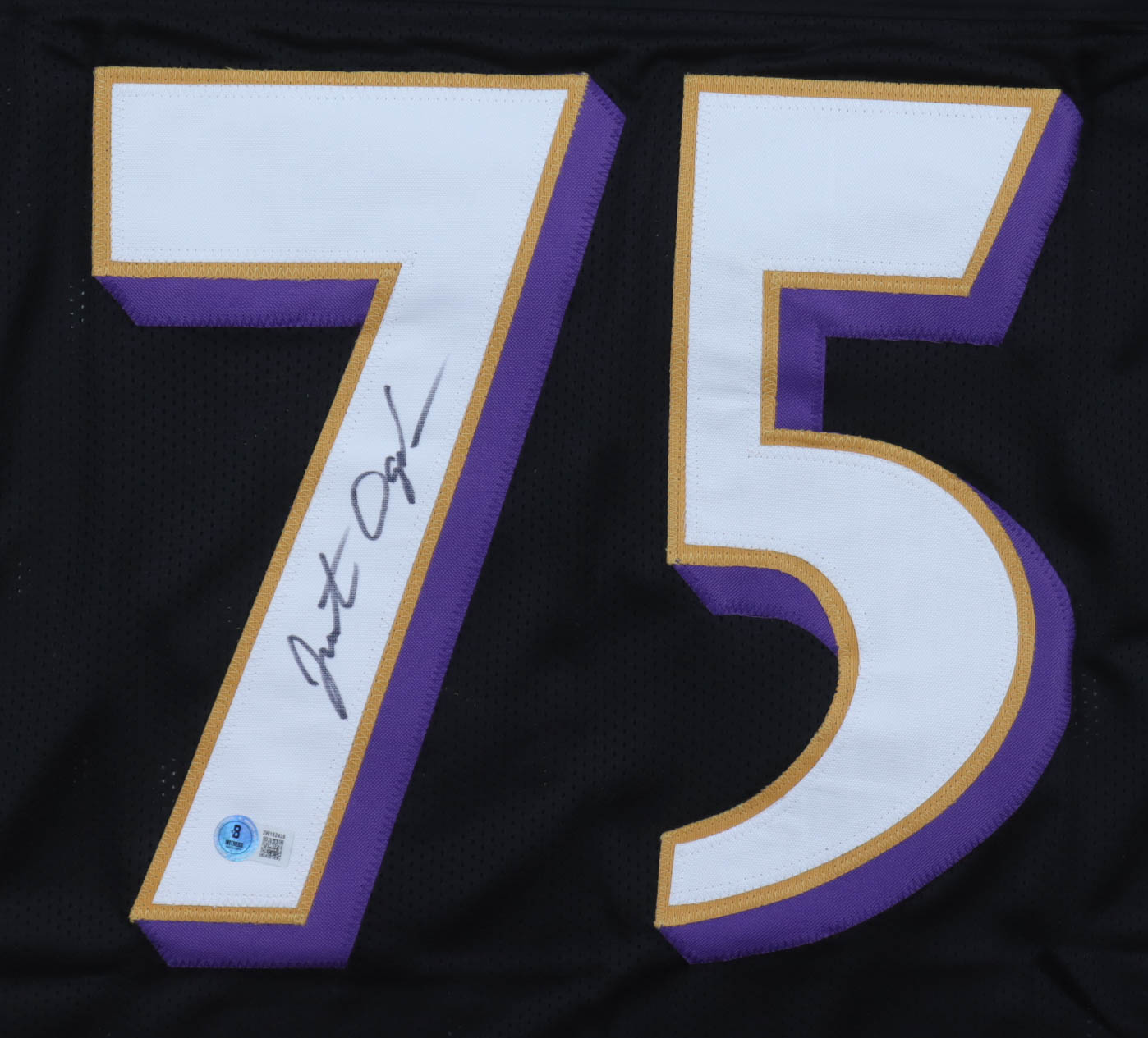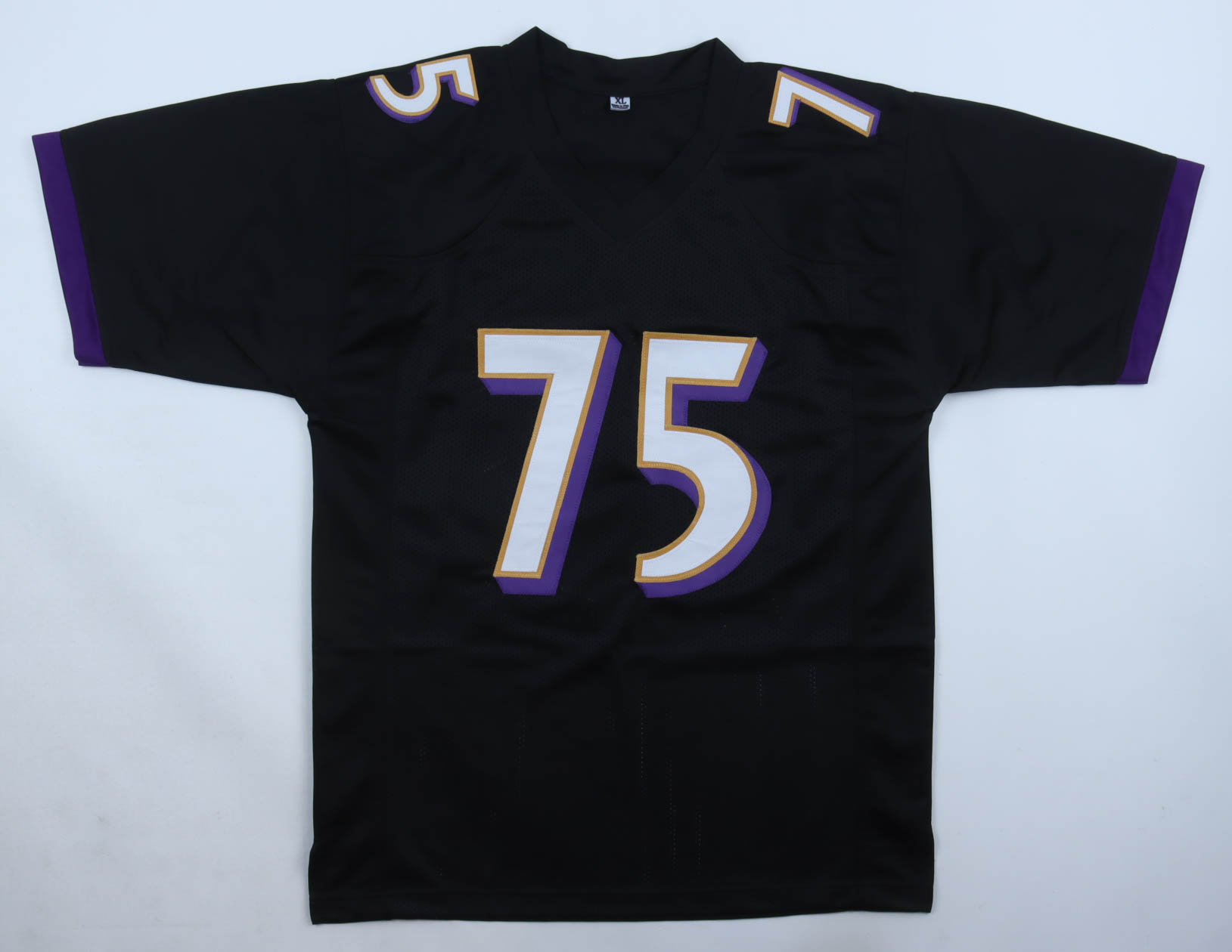 Custom jersey with everything sewn on, size XL. Hand-signed by Jonathan Ogden.
