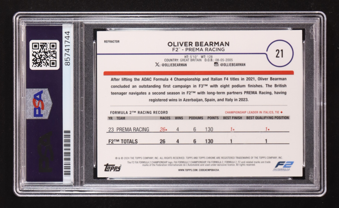 Oliver Bearman Signed 2024 Topps Chrome Future Stars Refractor #21 (PSA | Autograph Graded PSA 10)