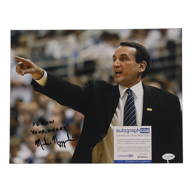 Mike Krzyzewski Signed Duke Blue Devils 11x14 Photo Inscribed "Follow Your Heart!" (ACOA)