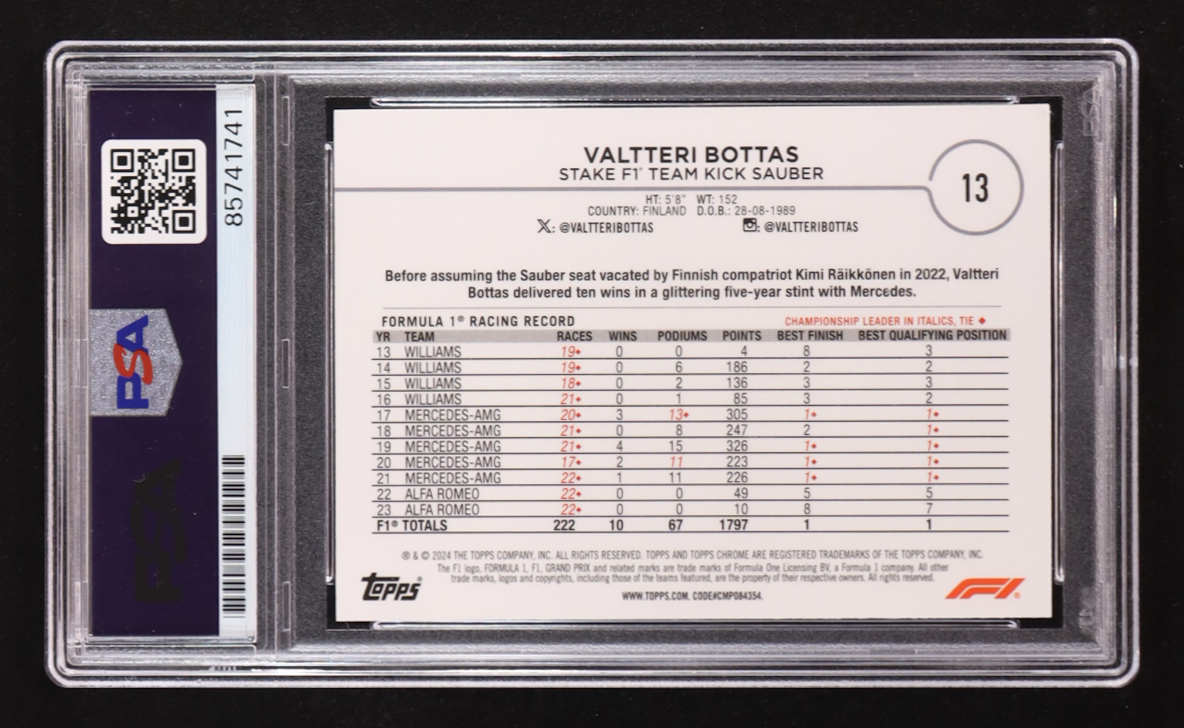 Valtteri Bottas Signed 2024 Topps Chrome #13 (PSA | Autograph Graded PSA 10)