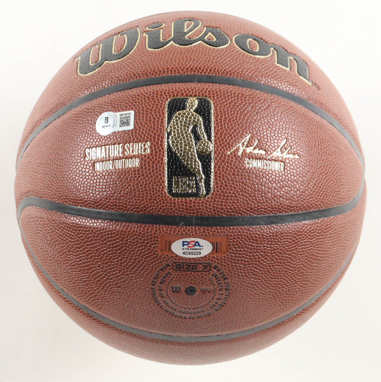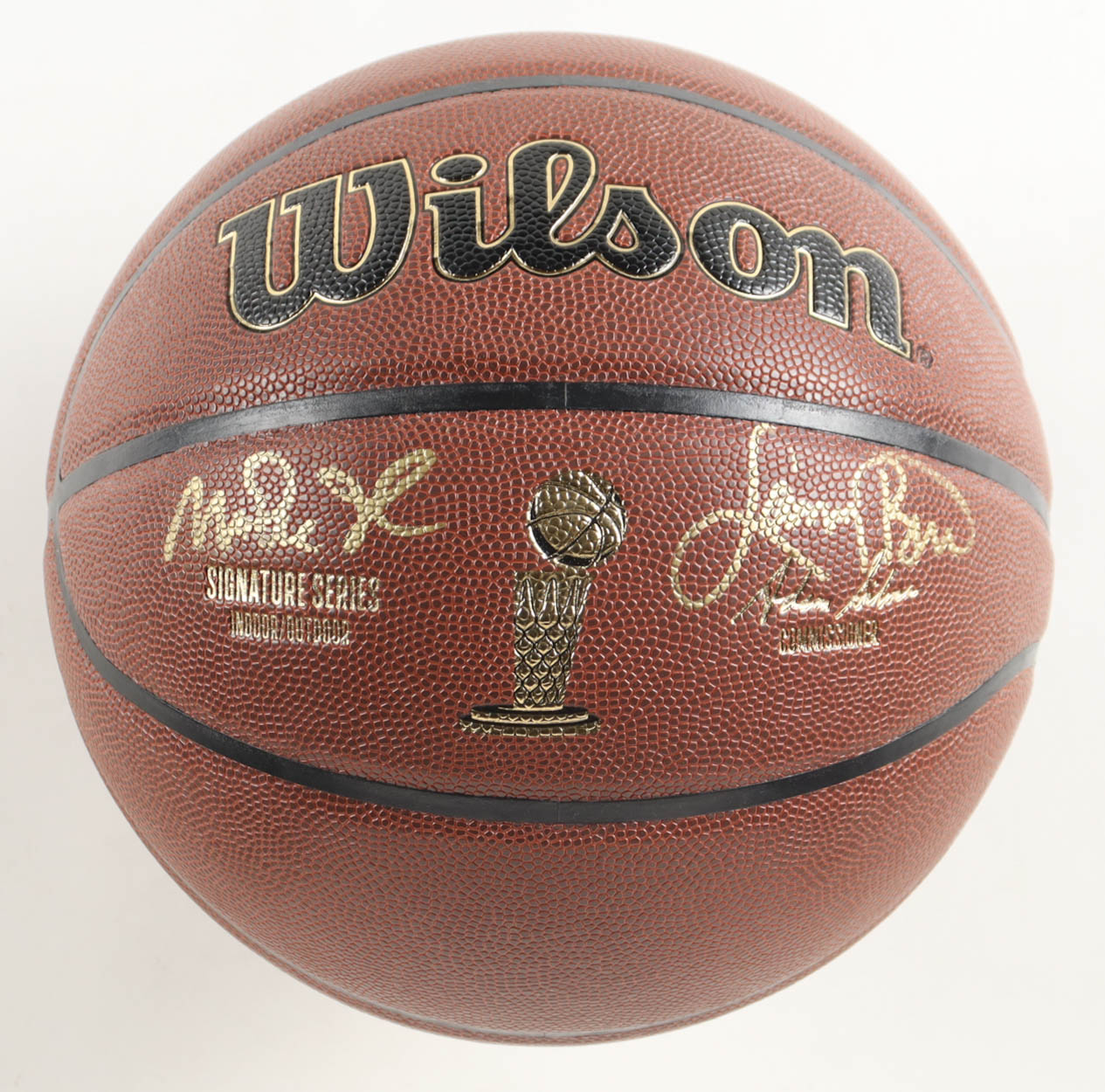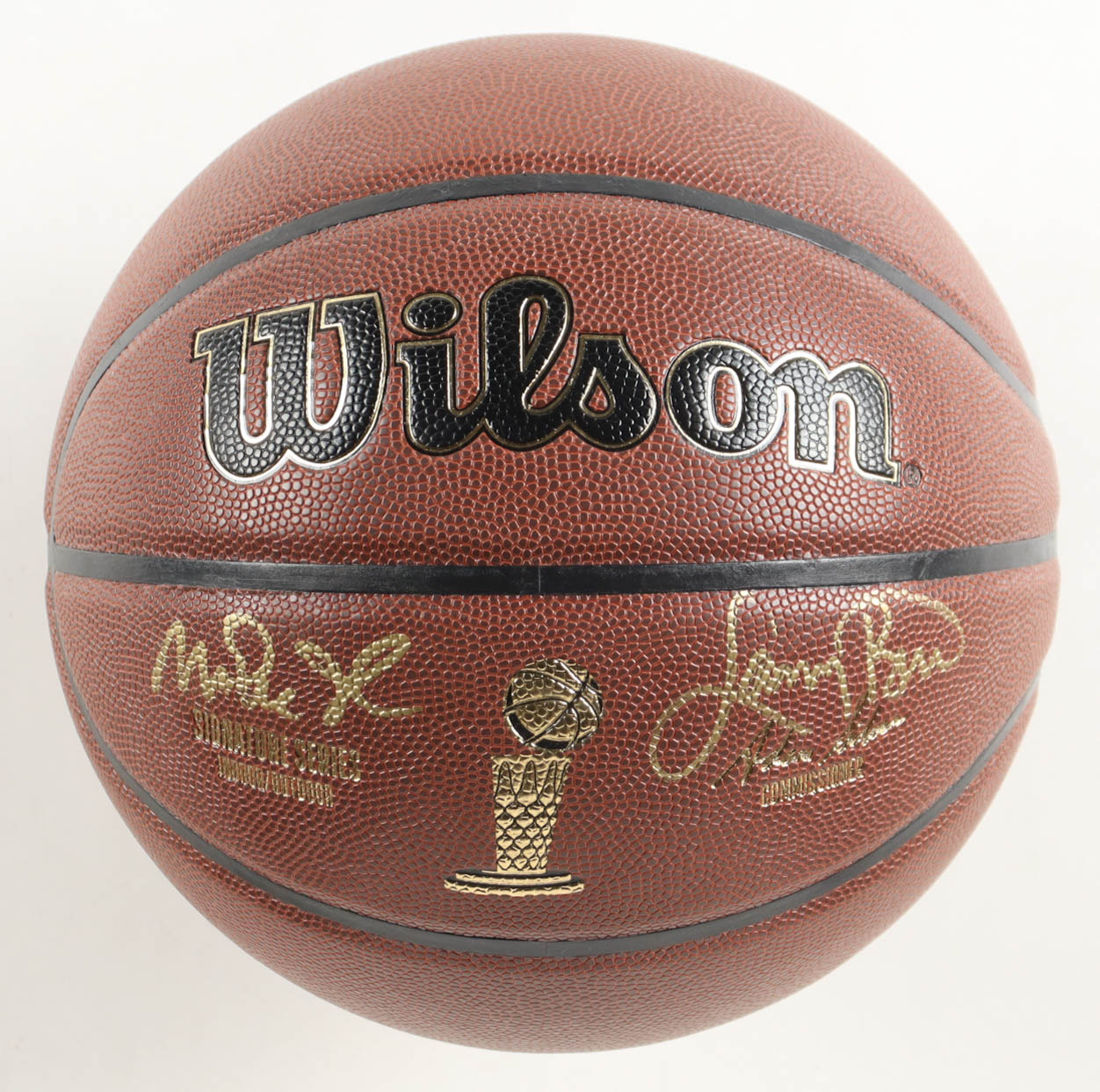 Wilson Signature Series Indoor/Outdoor NBA Finals Trophy Special Edition basketball. Hand-signed by Magic Johnson (Los Angeles Laker, HOF) and Larry Bird (Boston Celtics, HOF). Includes display stand.