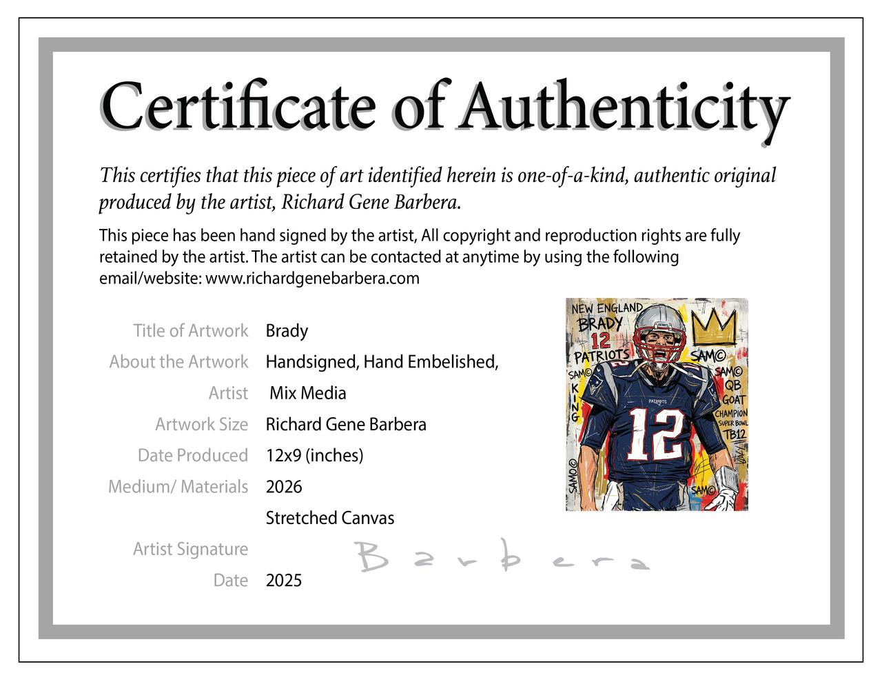 Richard Gene Barbera Signed "Tom Brady Crown" 2026 9x12 Original Art Canvas (Barbera)