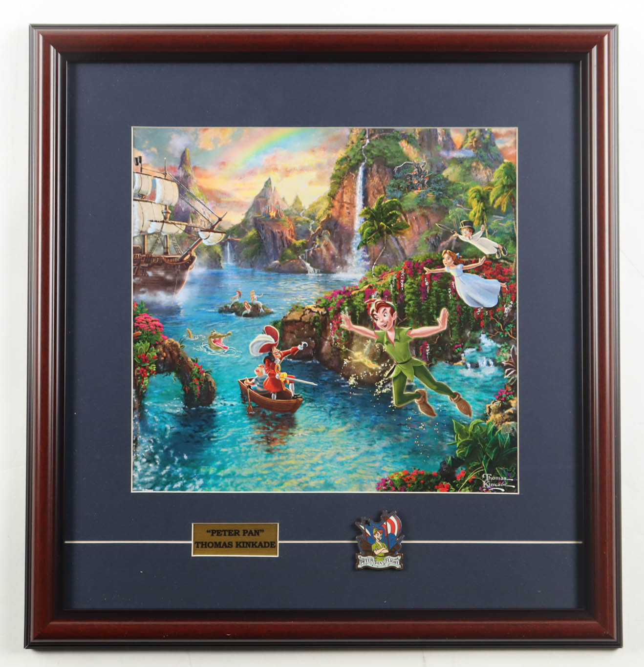 "Peter Pan & Captain Hook" by Thomas Kinkade Custom Framed Art Print Display with Disneyland Peter Pan Pin
