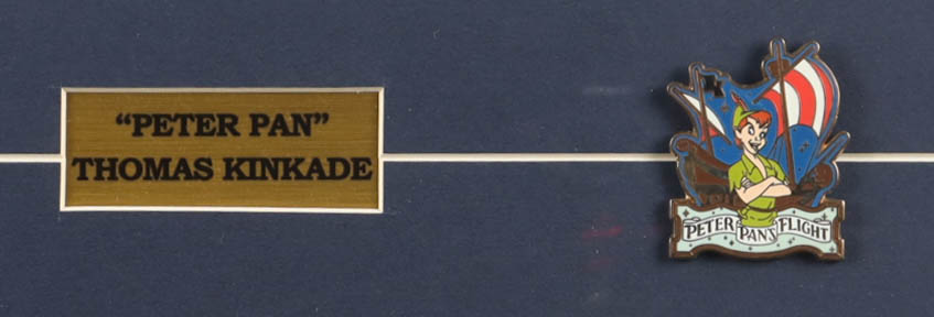 Custom framed print measures approximately 18" x 19" in size and features a print from Thomas Kinkade (D. 2012). The display also includes a Disneyland Peter Pan Pin and title plaque.