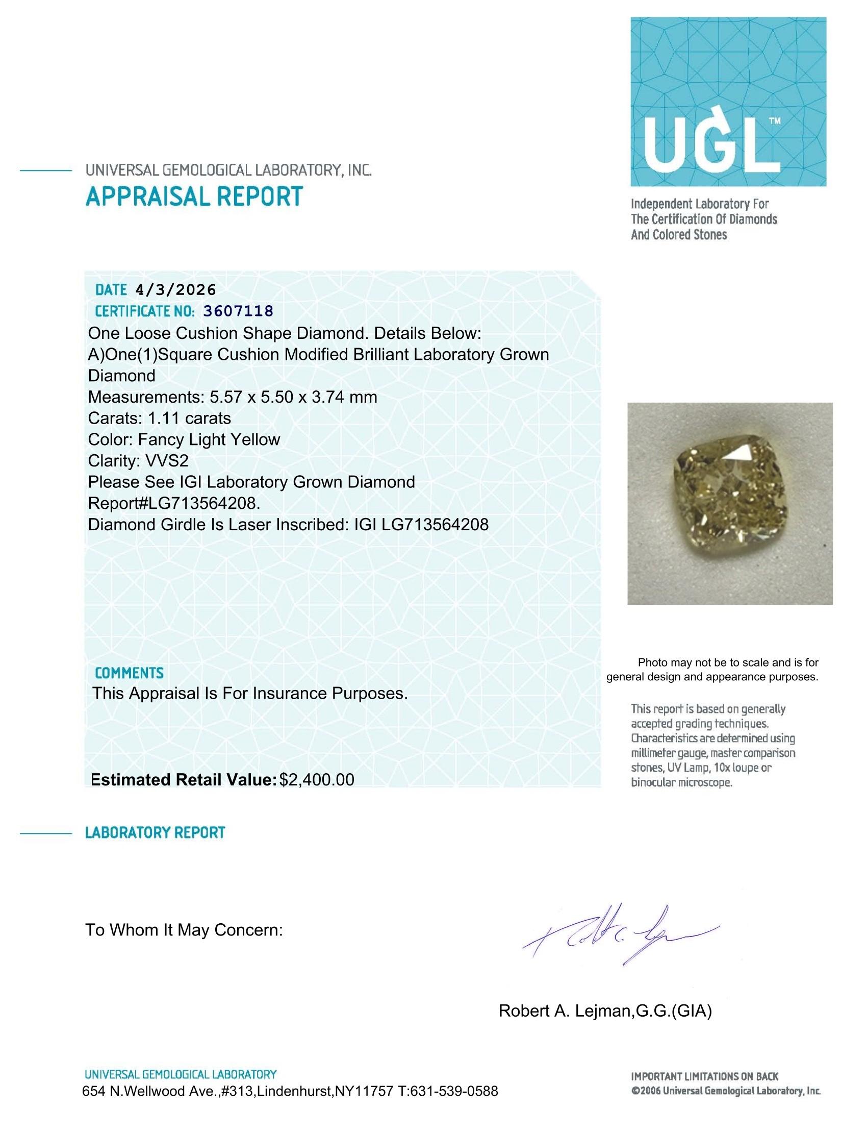 1.11 Carats Lab Grown FANCY LIGHT YELLOW Diamond Loose VVS2 | $2,400 Estimated Retail Value (UGL & IGI Certs)