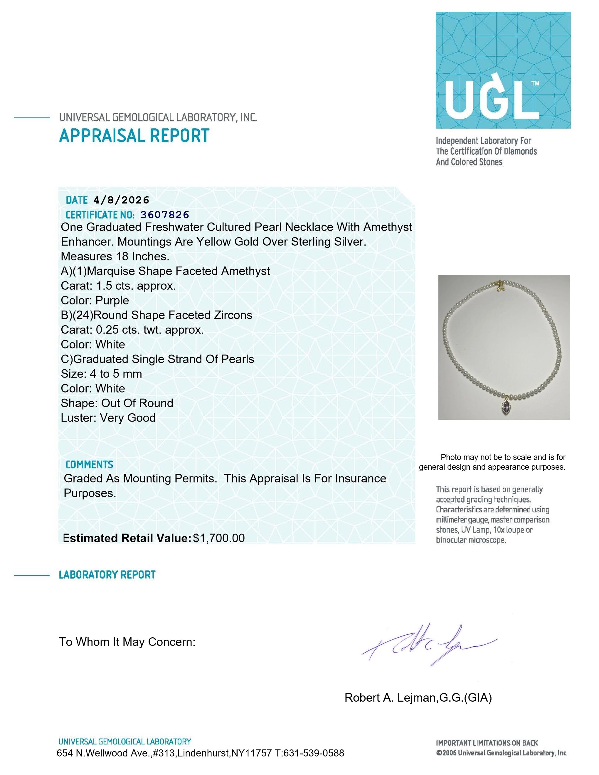 Freshwater Cultured Pearl & 1.50 Carats Natural Amethyst Necklace | $1,700 Estimated Retail Value (UGL Cert) | Brand New