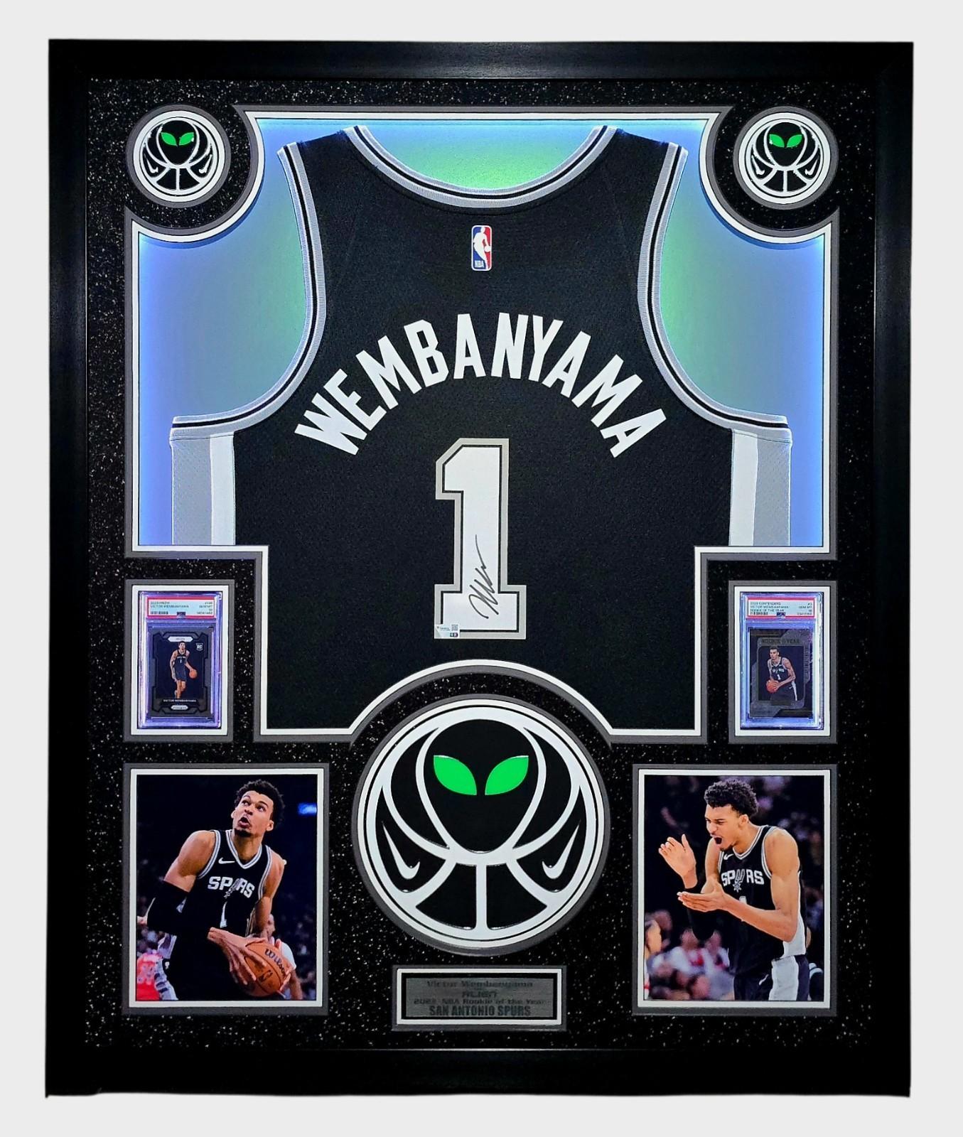 Custom frame measures 42" x 33" in size and features a Nike jersey that has been hand signed by Victor Wembanyama (San Antonio Spurs).