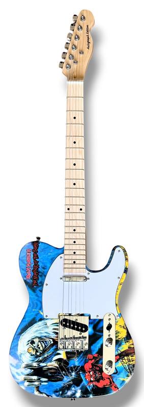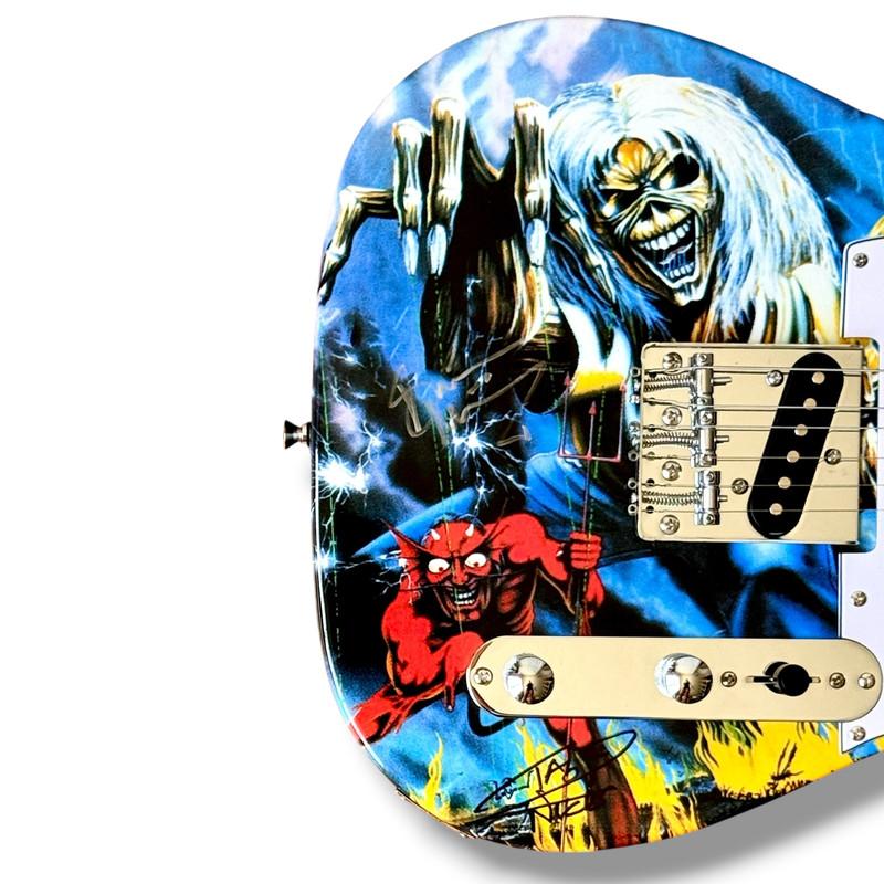 Custom Autograph Edition Telecaster style electric guitar measures approximately 39" in length and has been hand-signed on the guitar body by Bruce Dickinson (Lead Singer) and Nicko McBrain (Drummer).