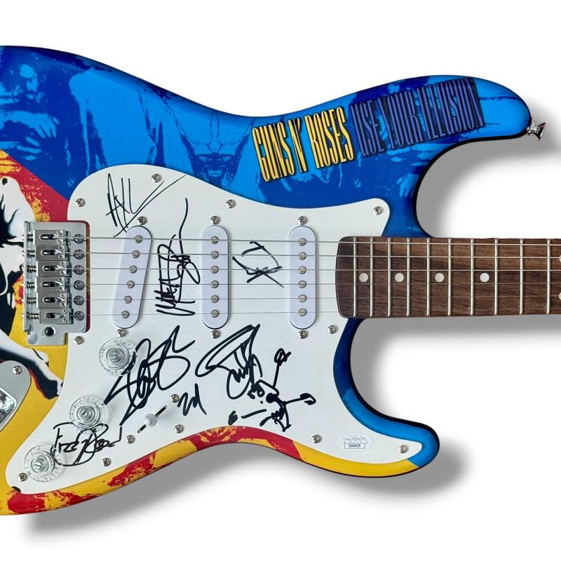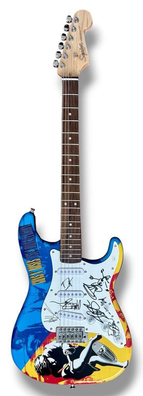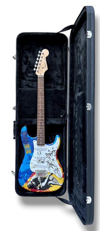 Custom Fender Squire Stratocaster electric guitar measures approximately 39" in length and has been hand-signed on thepickguard by Axl Rose (Lead Singer), Slash (Lead Guitarist), Duff McKagan (Lead Bassit), Dizzy Reed (Keyboardist), and Matt Sorum (Drummer). The guitar comes with a hard shell protective carrying case.