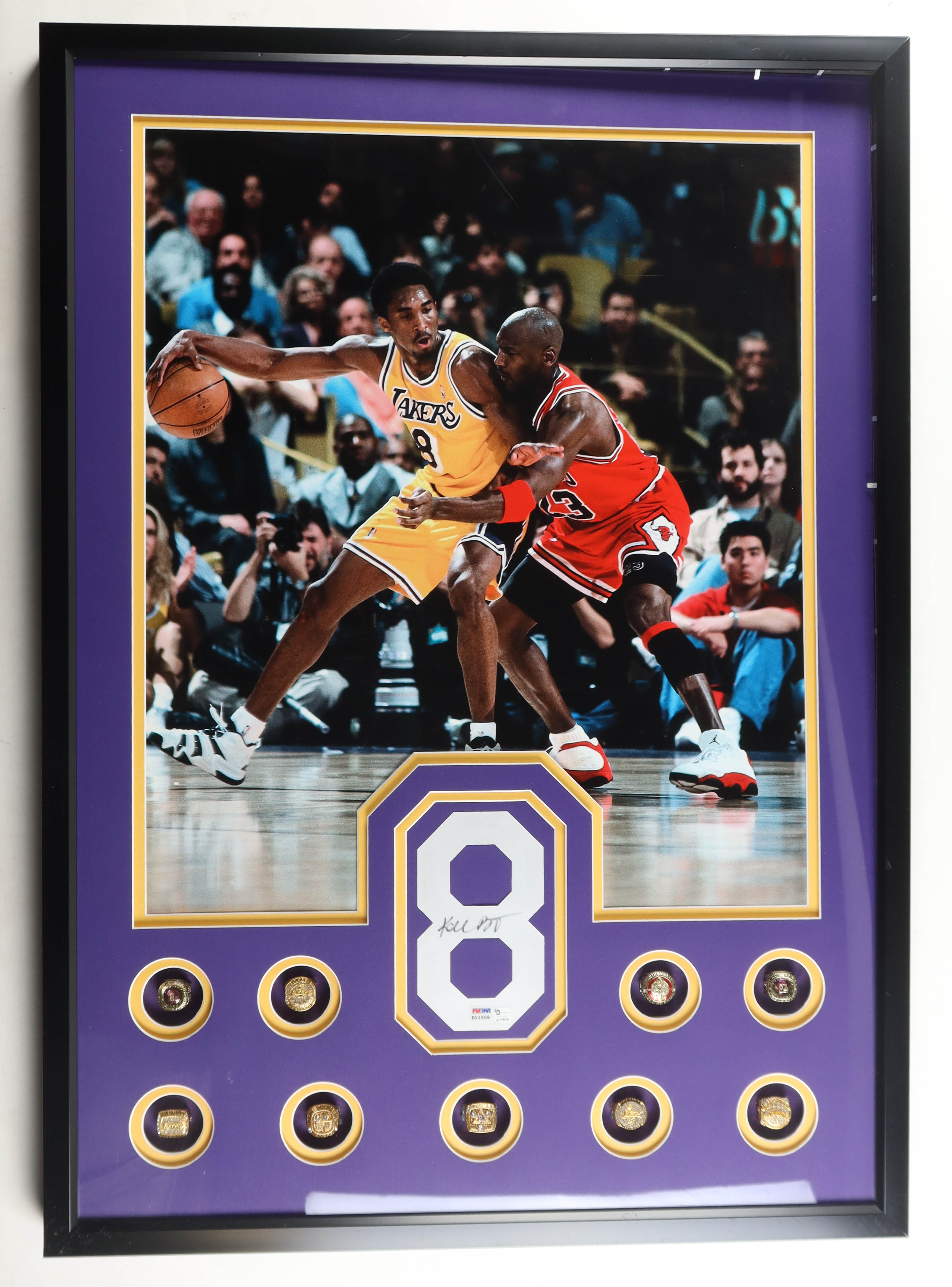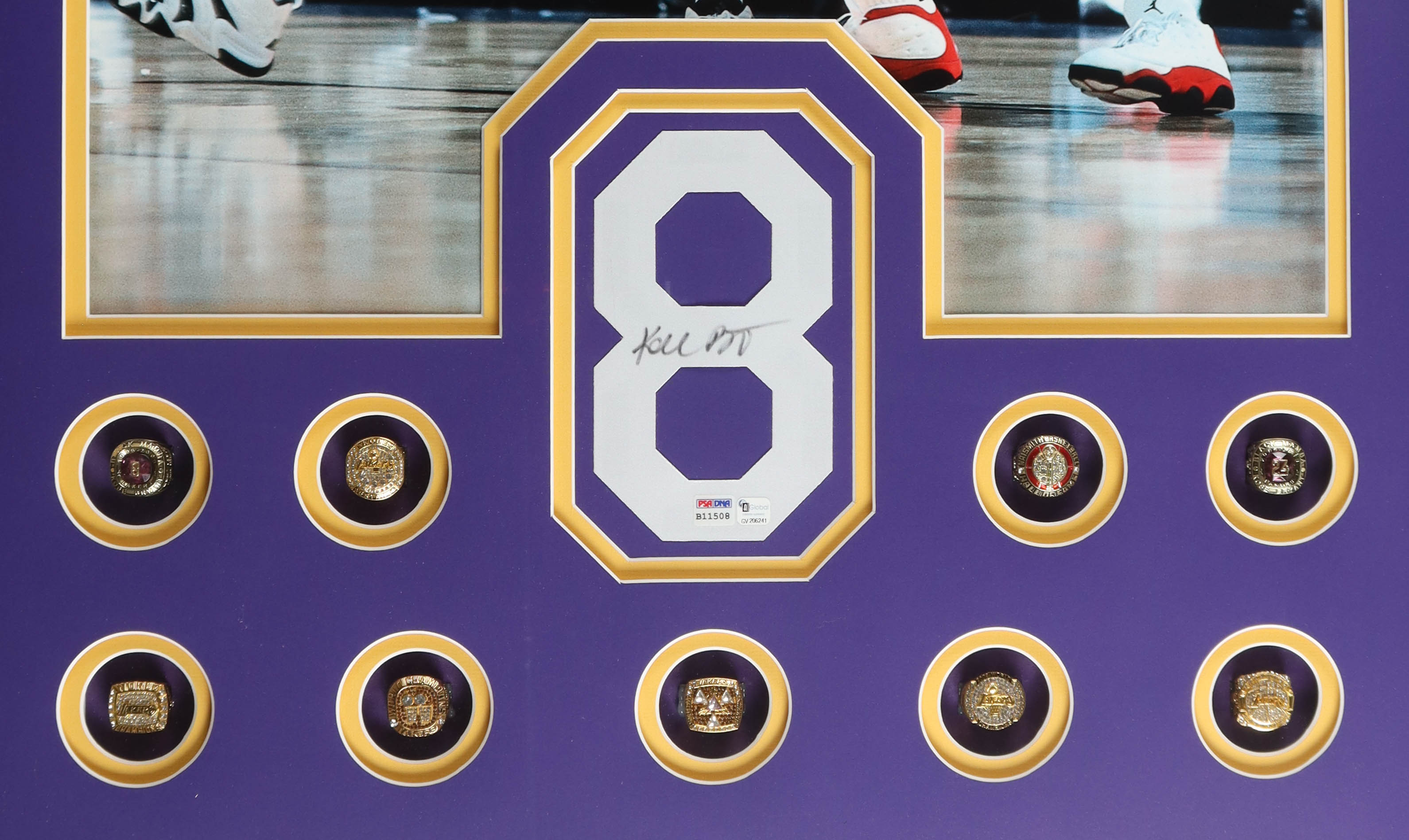 Kobe Bryant Signed Lakers Custom Framed Jersey Number Display with (9) Replica Championship Rings (PSA)