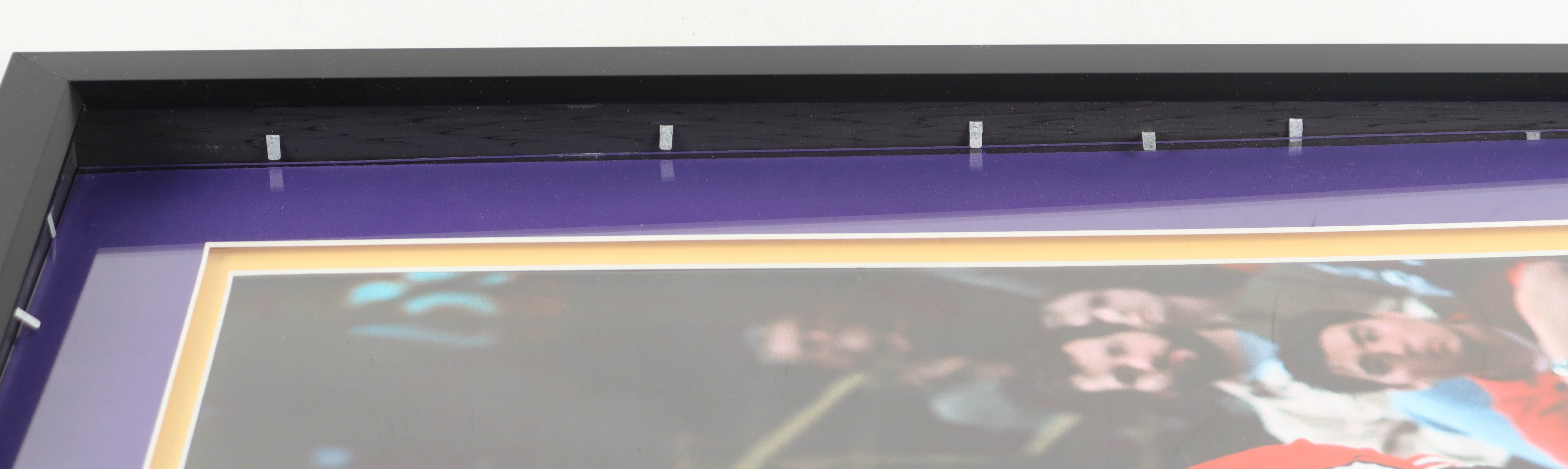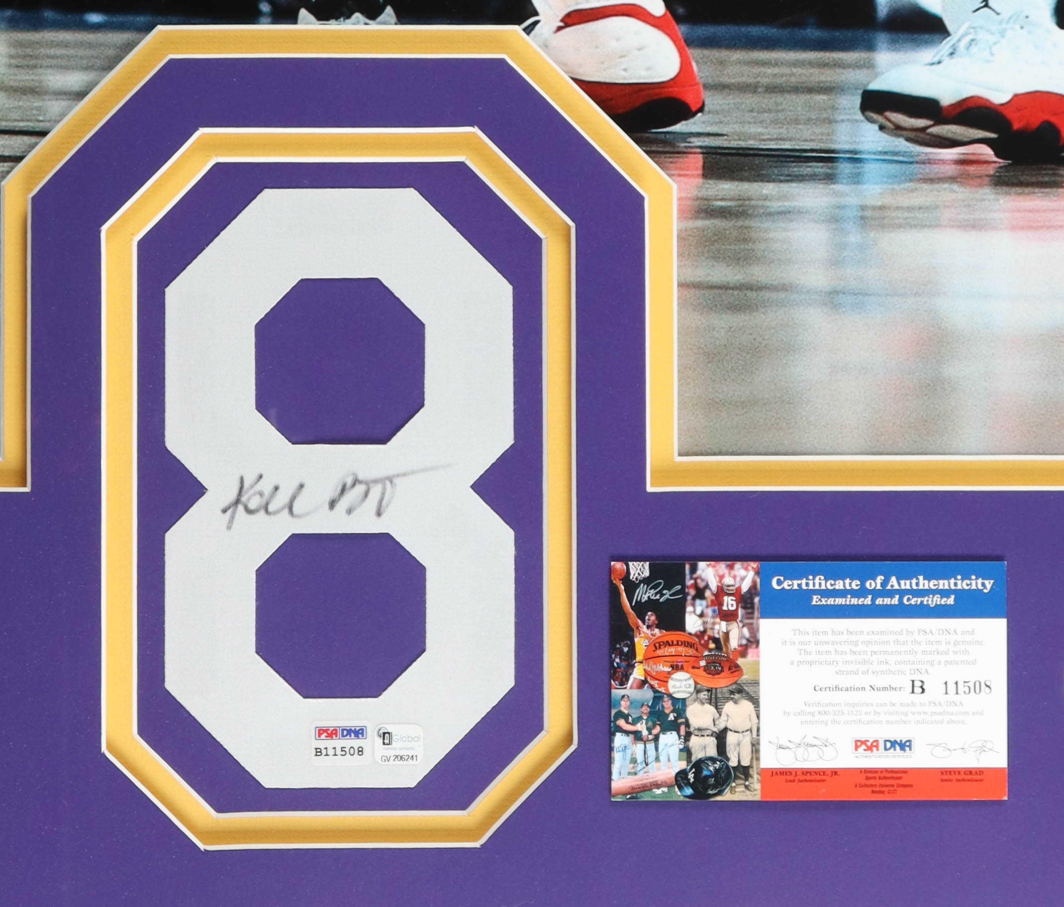 Custom frame measures approximately 30" x 42" in size and features a jersey number that has been hand-signed by Kobe Bryant (D. 2020, Los Angeles Lakers, HOF). Please note, the glass is not fully connected to the frame.