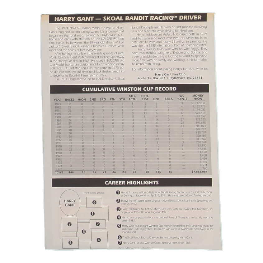 Harry Gant Signed NASCAR 8.5x11.5 Hero Card (Beckett)