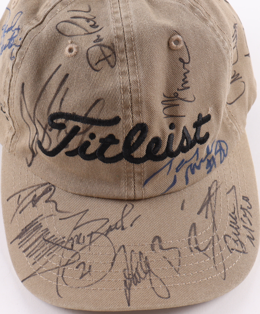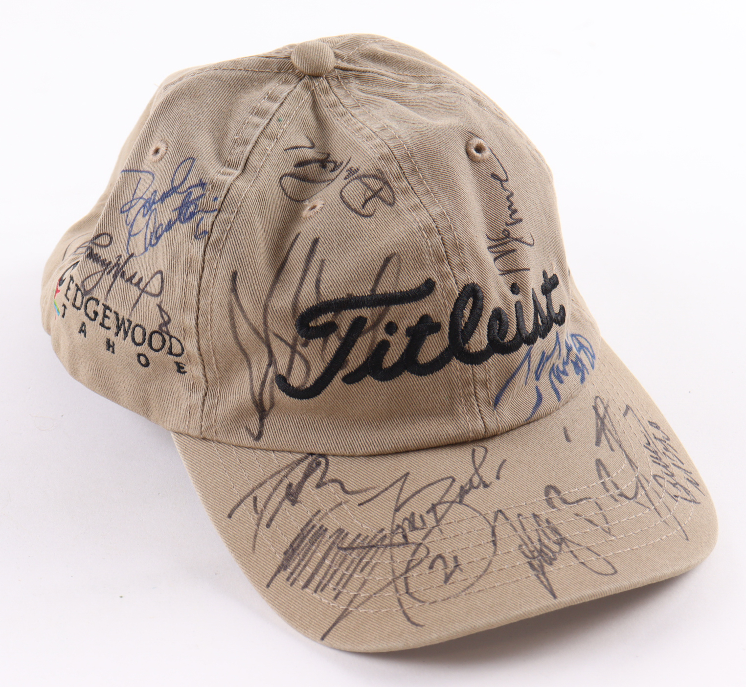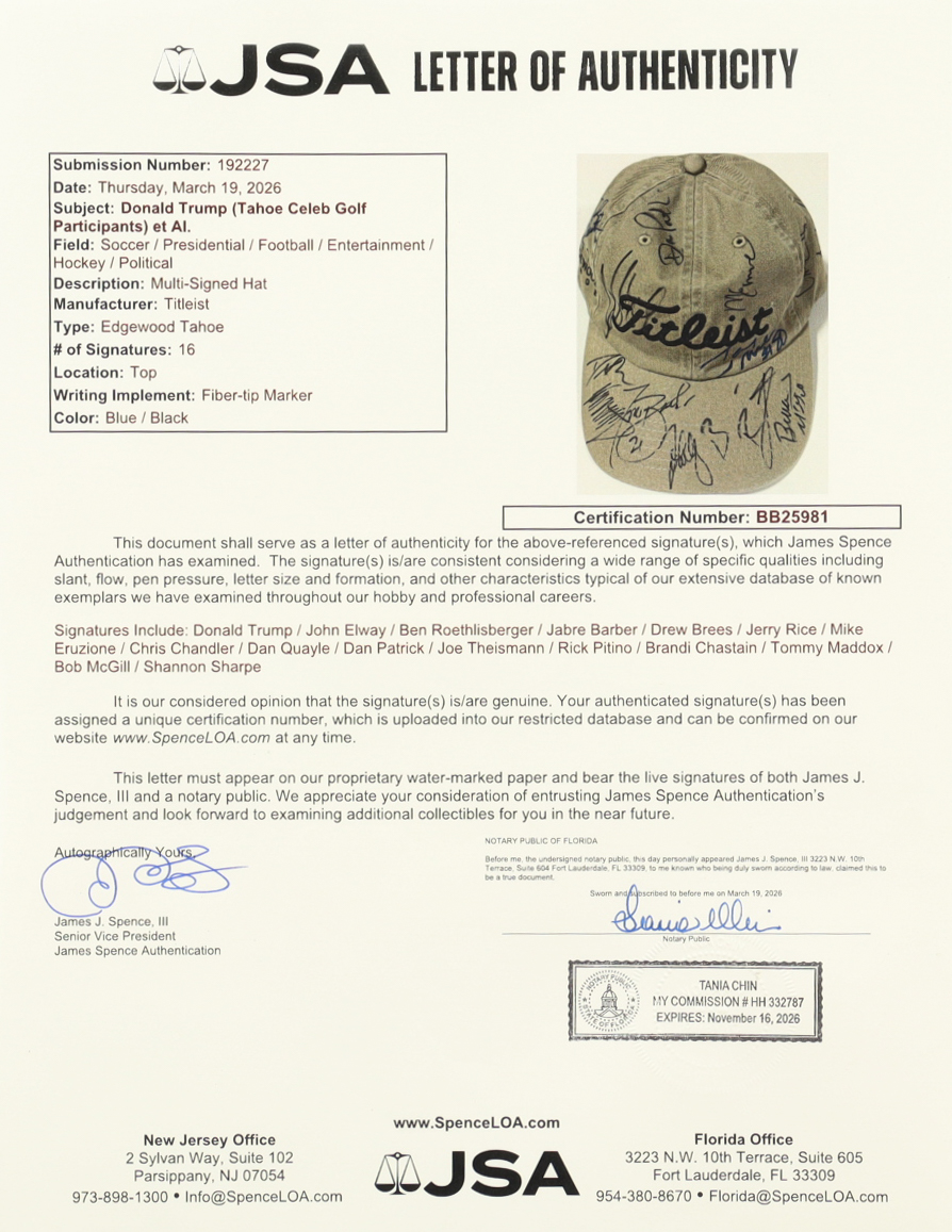 "Titleist" hat has been hand-signed by (16) participants of the Tahoe Celebrity Golf tournament including President Donald Trump and Football Hall of Famers John Elway, Jerry Rice, and Drew Brees!
